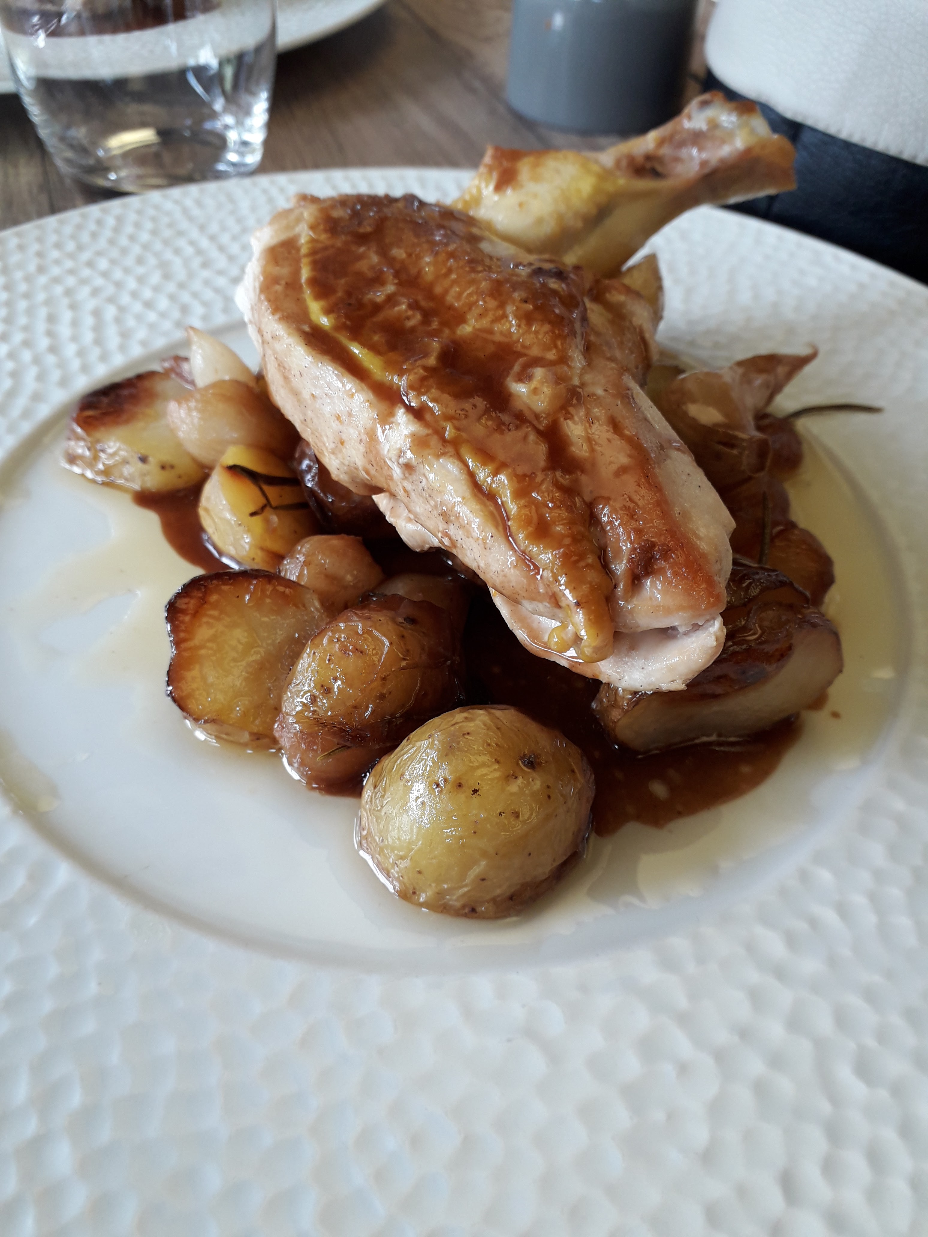 Plat poulet avec ses patates servi à peine tiède et trop de sel dans l'assiette de frites prise en supplément. Pas de Demi bouteille de vin ou de pichet du coup on a du prendre une grande bouteille de rosé pour 2 , vu le prix d'un verre.