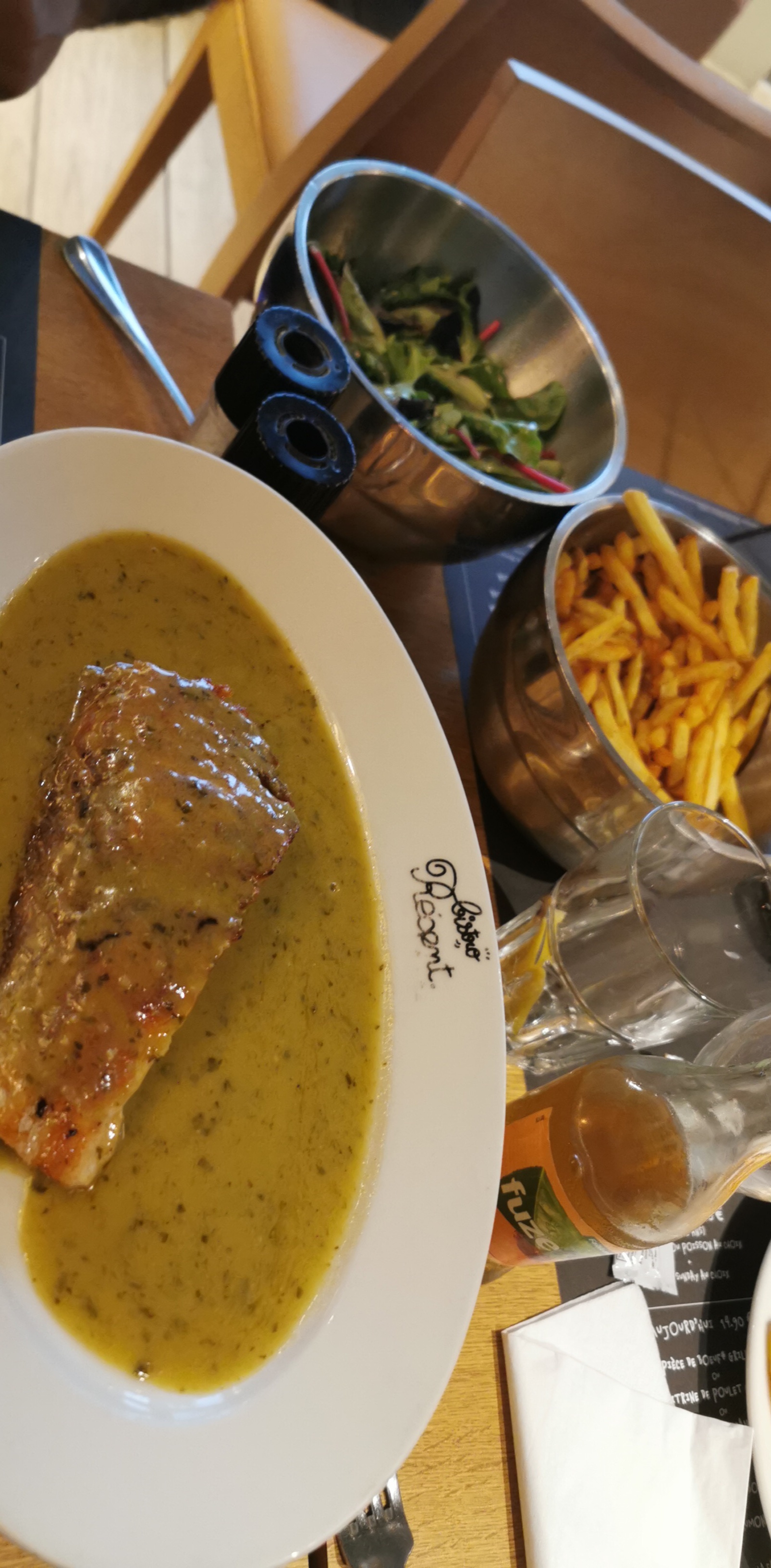 Bonjour, un bon repas dans un cadre agréable. Nous avions pris de l’escalope de saumon (très bon) accompagné de frites et salade. Et pour couronner le tout un petit café gourmand 😋. Franchement je recommande ce restaurant. Merci pour l’accueil et le service. Bonne continuation à toute l’équipe..! 😊 Ps. Le seul petit bémol est la résonance quand il y a foule… sinon c’est topissime tant pour un repas en amoureux que pour un repas entre amis et où en famille et où entre collègues..!