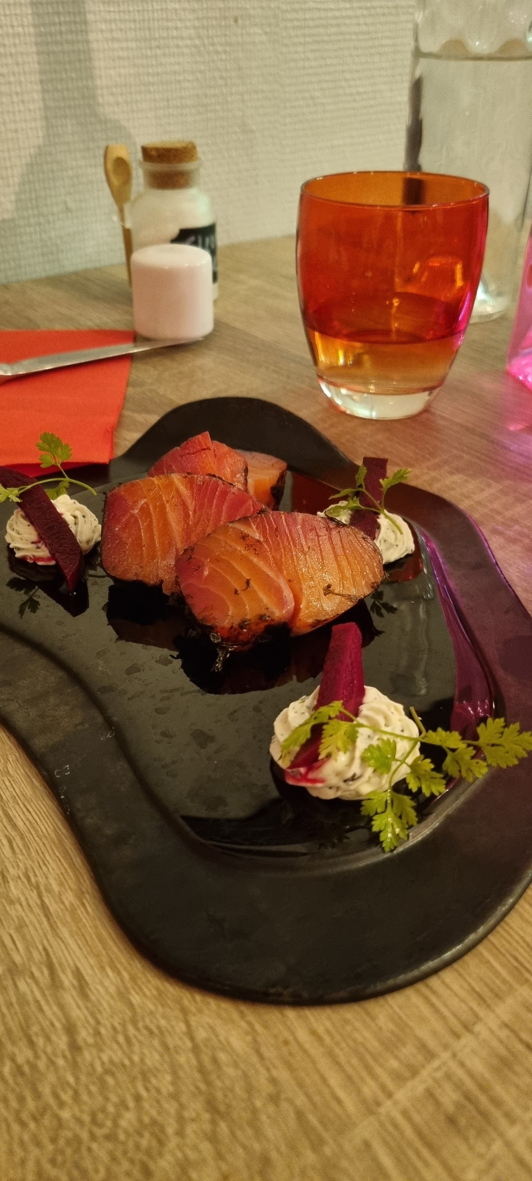 Découverte d'une petite pépite, un régal, entrée et plat pour moi (je ne suis pas dessert) un sans faute jusqu'à la sélection du vin. En entrée j'ai voulu goûter cette intriguante panacotta de betterave : aérée, succulente... j'en aurais pris une autre si ma femme ne surveillait pas... En plat principale, j'ai testé le Burger au magret de canard, étant moi même amateur de burger et les faisant souvent à la maison, en un mot : fantastique.