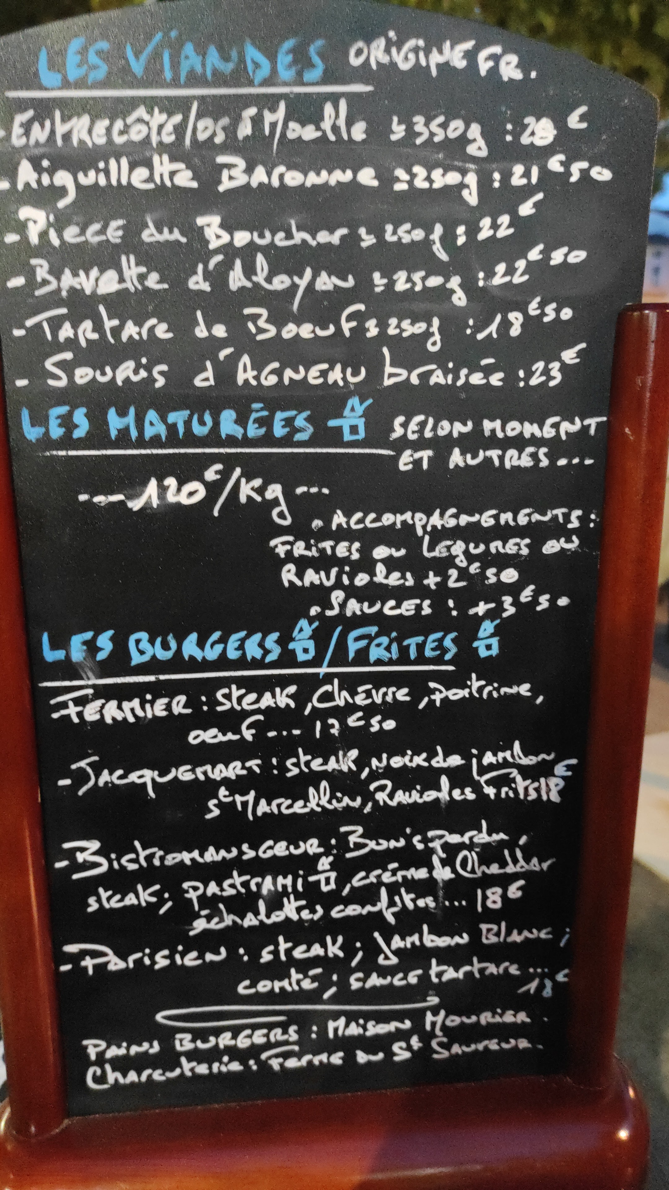 L'Entrecôte de boeuf charolais maturée en circuit court est une tuerie, des vins locaux au pichet et un acceuil très chaleureux. Pensez à reverver ! Ouvert même en hiver avec une météo défavorable.,à decouvrir et revenir. Ps: tout les desserts sont fait maison (sauf avis contraire, mais l' autre est du meilleur boulanger/patissier du coin ^^)