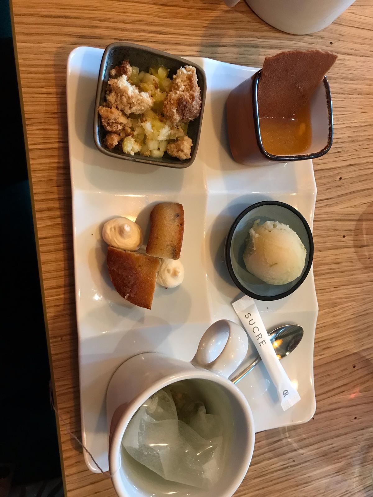 Un repas très agréable avec une cuisine fine, bien présentée et généreuse à un prix raisonnable le soir (34€ sans boisson) pour un établissement qui se veut d'un standing plus haut qu'un bistro classique et privilégie donc l'originalité et le circuit court (les suggestions du jour montrent bien l'ingéniosité du chef). Petit bémol sur les desserts glace chocolat blanc onctueuse mais un peu trop sucrée (bon après c'est du chocolat blanc...), et praliné (si rare en resto hélas) au goût pas assez prononcé. Nous y reviendrons pour le pigeon et les autres surprises du chef!