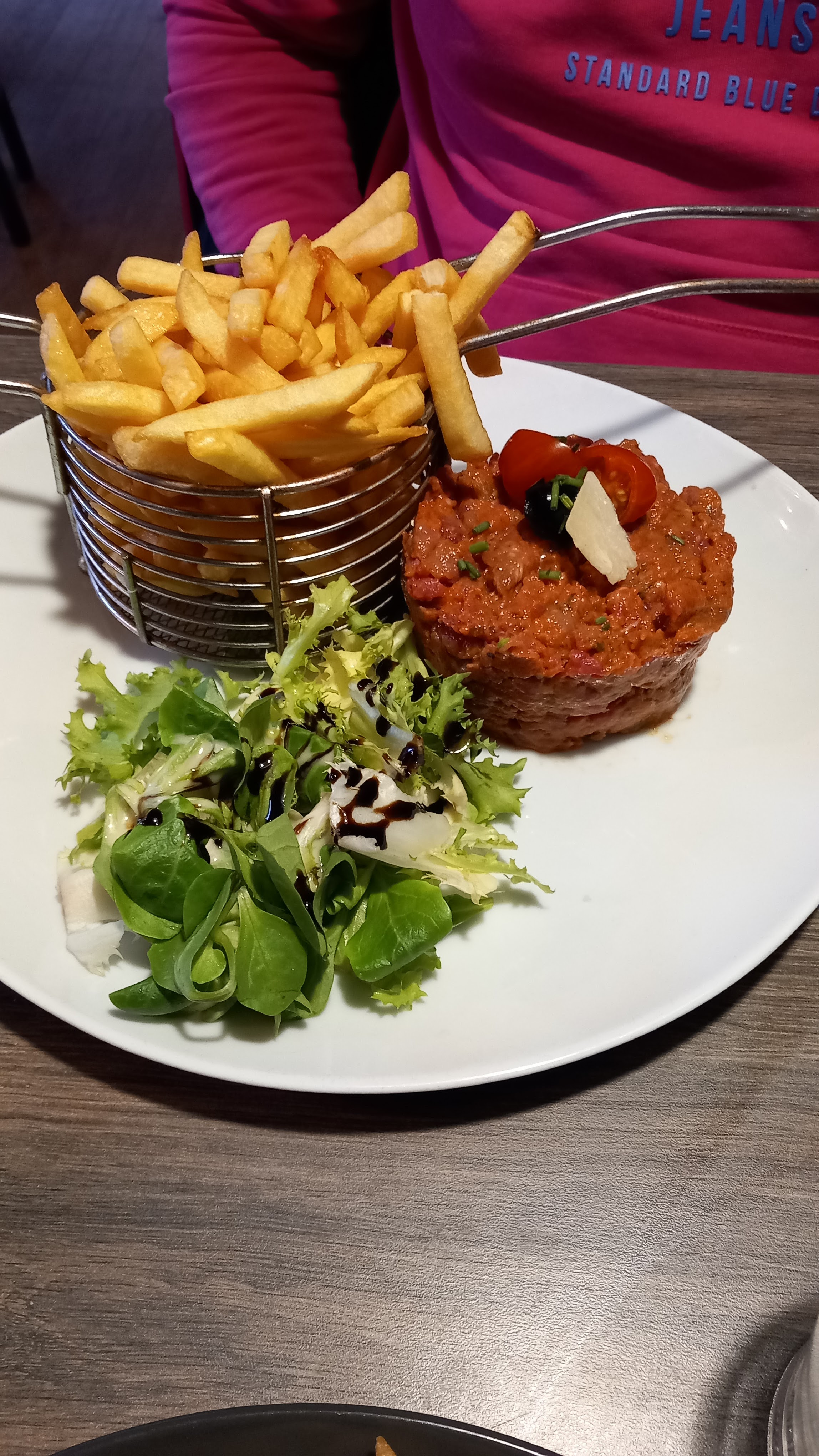 vin très bon , cuisson juste ( très rare) bonne nourriture fraîche a part les frites , jeune homme en cuisine très professionnel , moment très agréable.
