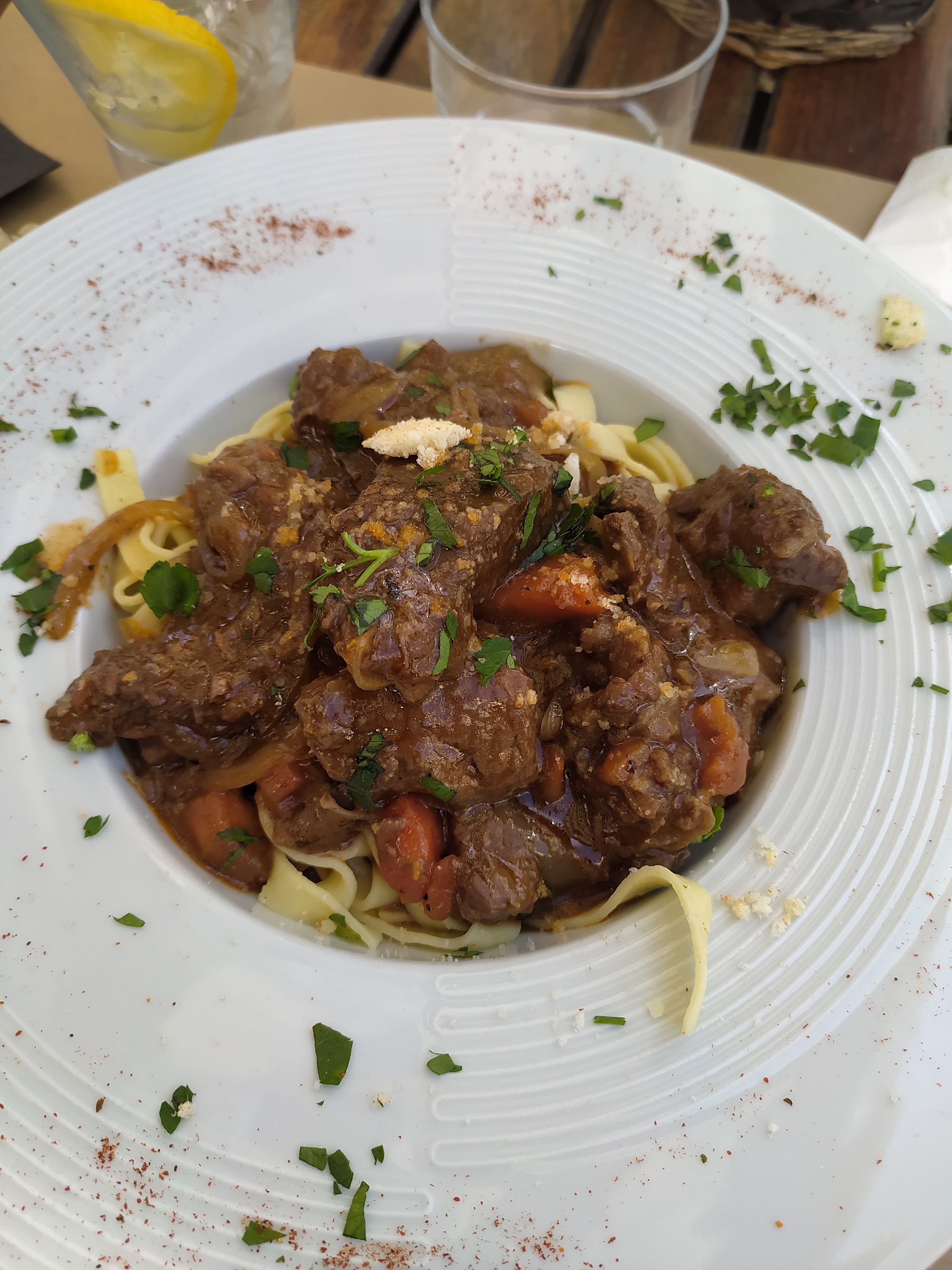 Repas du jour à prix très correct. Bœuf à la bourguignonne ce jour là avec des pennes. Excellent très bien cuisiné, bref un regal. Et dessert fait maison 👍Je recommande. Seul bémol par temps de covid 19, monsieur le serveur, mettez votre masque pendant le service ! Sous le menton il ne sert à rien 😉
