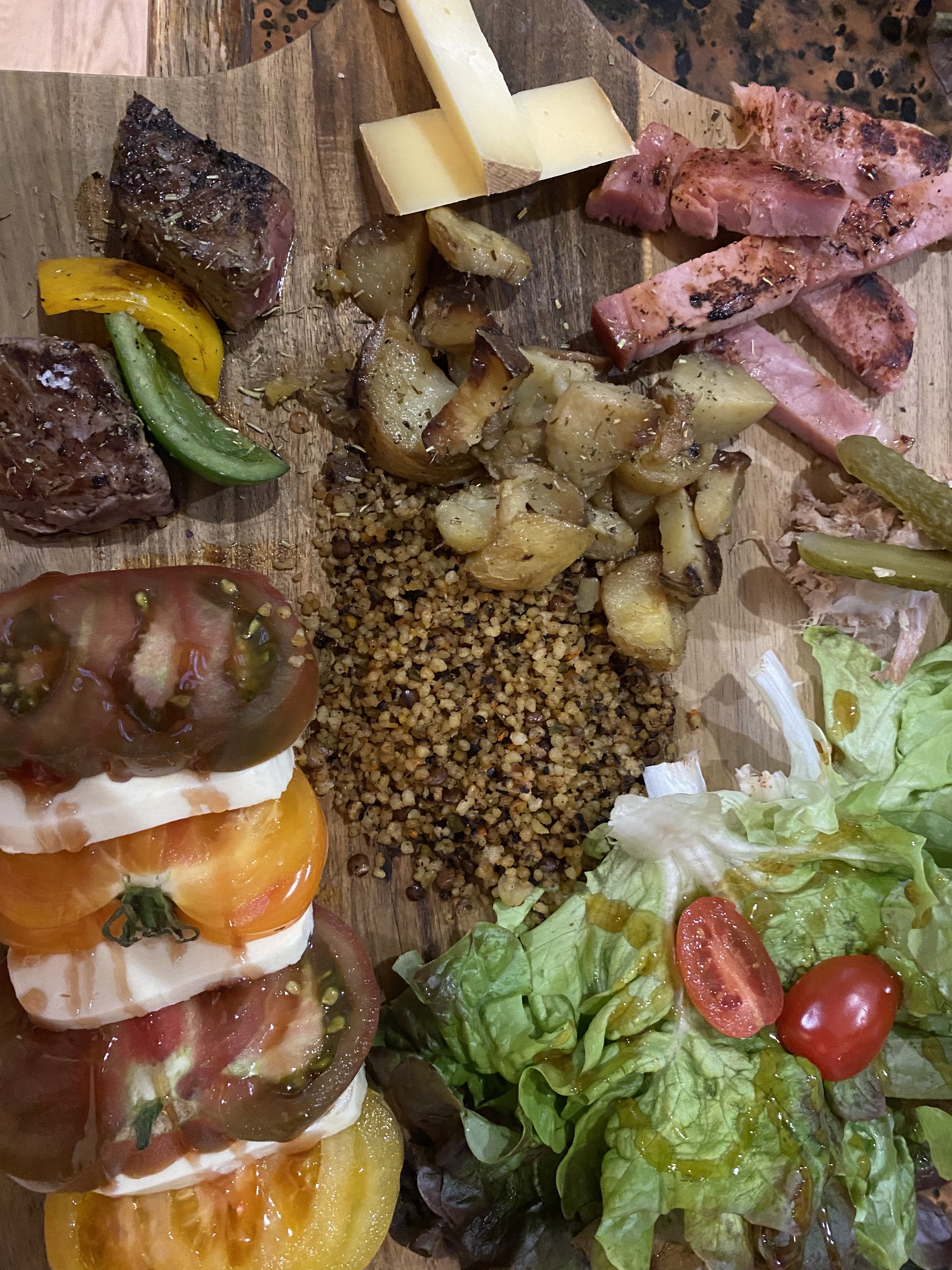 Arrivés tardivement dans ce petit bourg médiéval de la Mayenne Avons été chaleureusement accueilli par l’hôte des lieux, Planches de charcuterie, bœuf, légumes, comté,légumes, kinoa ,copieuses nous a totalement rassasiés à l’étage.(pain bio excellent) Attentif à la clientèle , lieu décontracté.