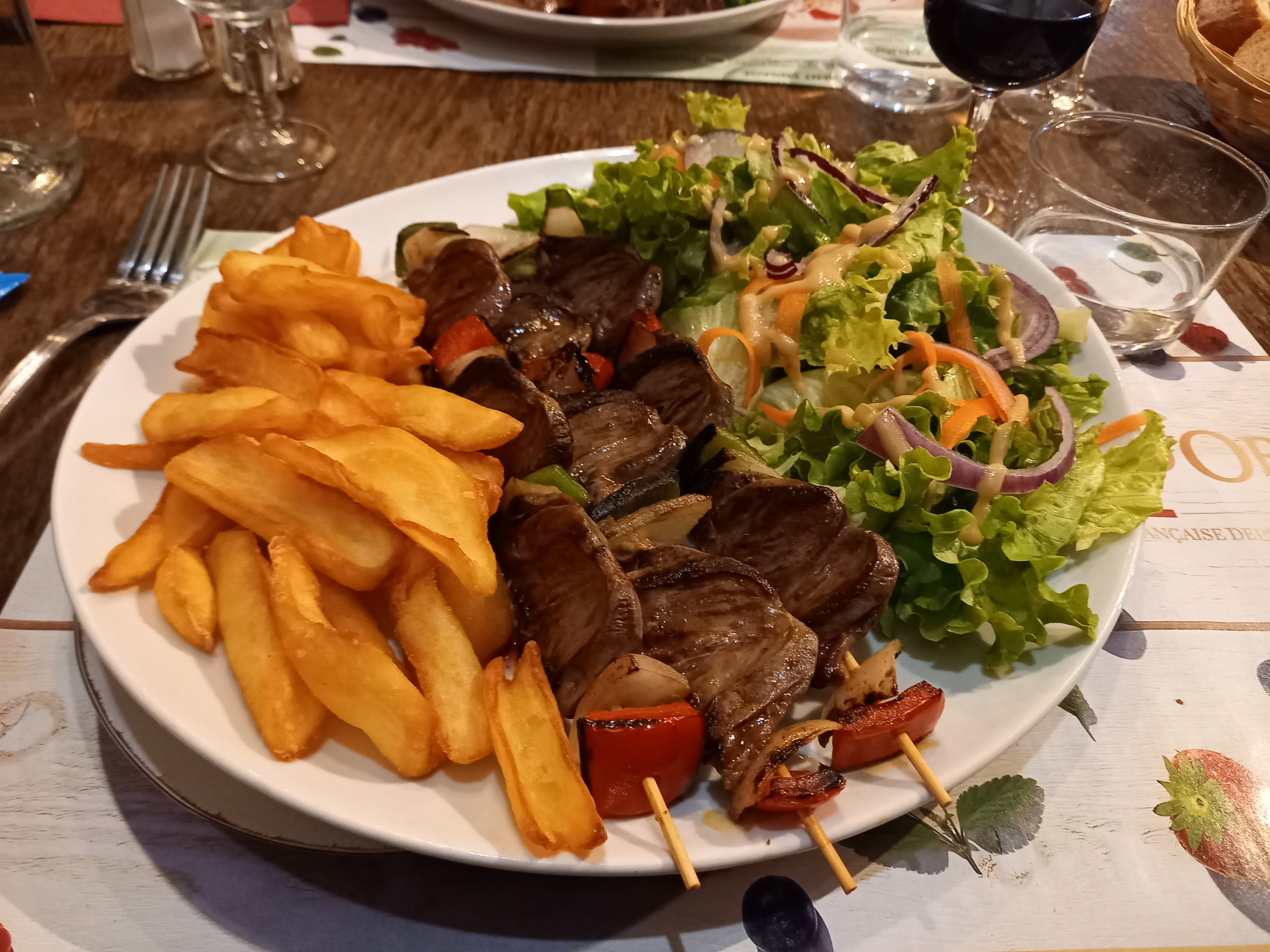 Accueil simple, délicat et chaleureux. Cuisine du terroir ou classique, avec pour chacune une cuisson demandée parfaite (bavette et brochettes de cœurs de canard). Double portion de frites car en plaisantant j'ai signalé que j'étais en manque, mais sans l'avoir réclamé. Détail commercial qui touche par le principe. Très très bon rapport qualité/prix. Nous reviendrons.