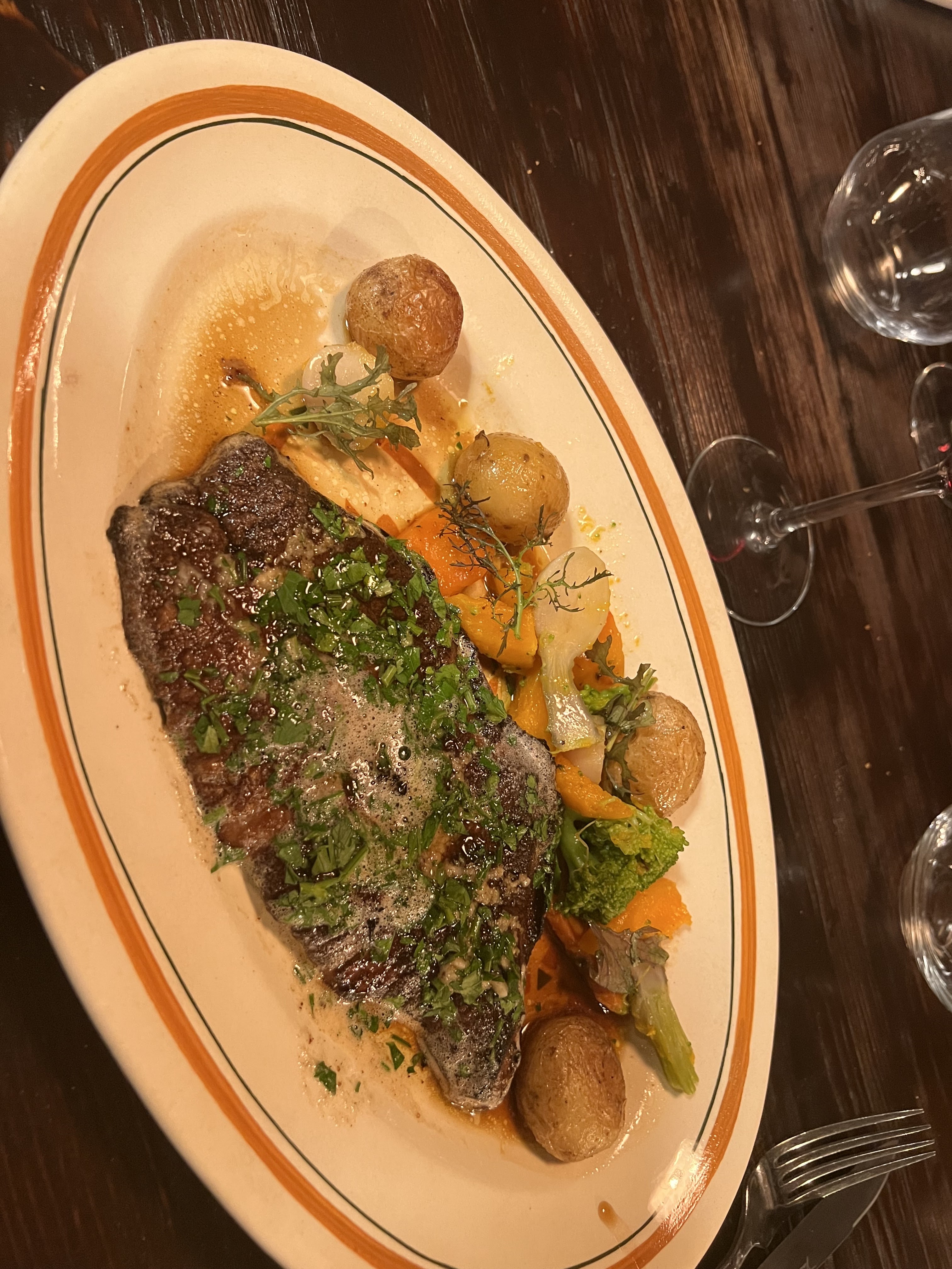 Très bon diner, rien à dire, foie de veau juste excellent, crémeux chocolat à tomber par terre, on aurait aimé en avoir plus dans les assiettes par pure gourmandise.