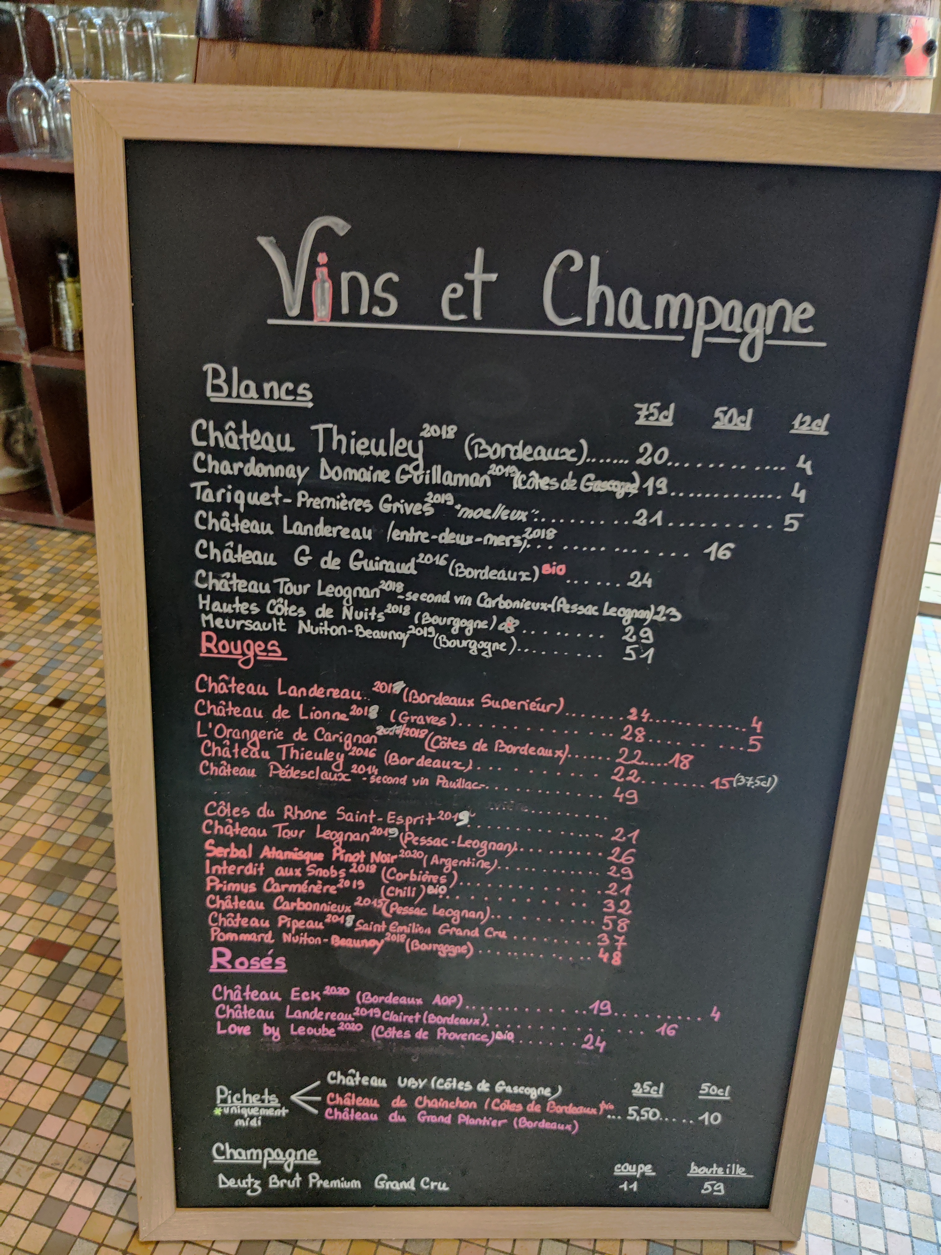 C'est un petit bijou à proximité de l'hôtel St. James à Bouliac. C'est bien mieux que le café étoilé Michelin près de la rue. James. Si vous pouvez faire la descente depuis Bouliac, c’est là que les locaux mangent et bien mangent ! Installez-vous en terrasse et dégustez le menu du jour. Mon entrecôte était meilleure qu'à la « Terrasse » de Bouliac et bien moins chère. Parfaitement cuisiné avec une belle « petite salade verte » et d'excellentes frites. La plupart des déjeuners coûtent environ 17 €. Les propriétaires ne me remercieront probablement pas car ils vont désormais accueillir tous les touristes.
