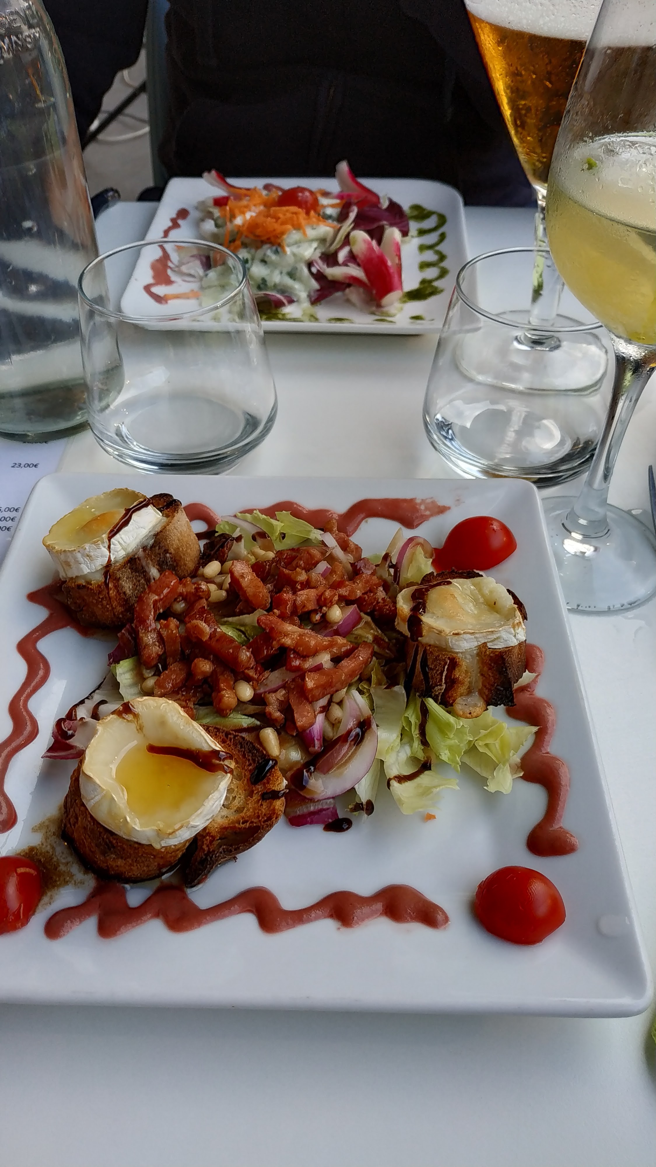 Nous nous sommes arrêtés pour manger à 13h. La terrasse était à moitié pleine. Sur la devanture menu E+P+D à 12€50 à l’intérieur on nous l’annonce à 13€50. Entrée salade de légumes : une cuillère à soupe de carottes râpées, 5 morceaux de betteraves et 4 lamelles de concombre. PJ correcte : linguines et travers porc. Les pâtes étaient froides. Dessert : assiette de fromage : 2 pauvres morceaux fades. Sans compter la demie heure d’attente avant qu’on prenne notre commande et les boissons. Nous sommes repartir 2 h plus tard.