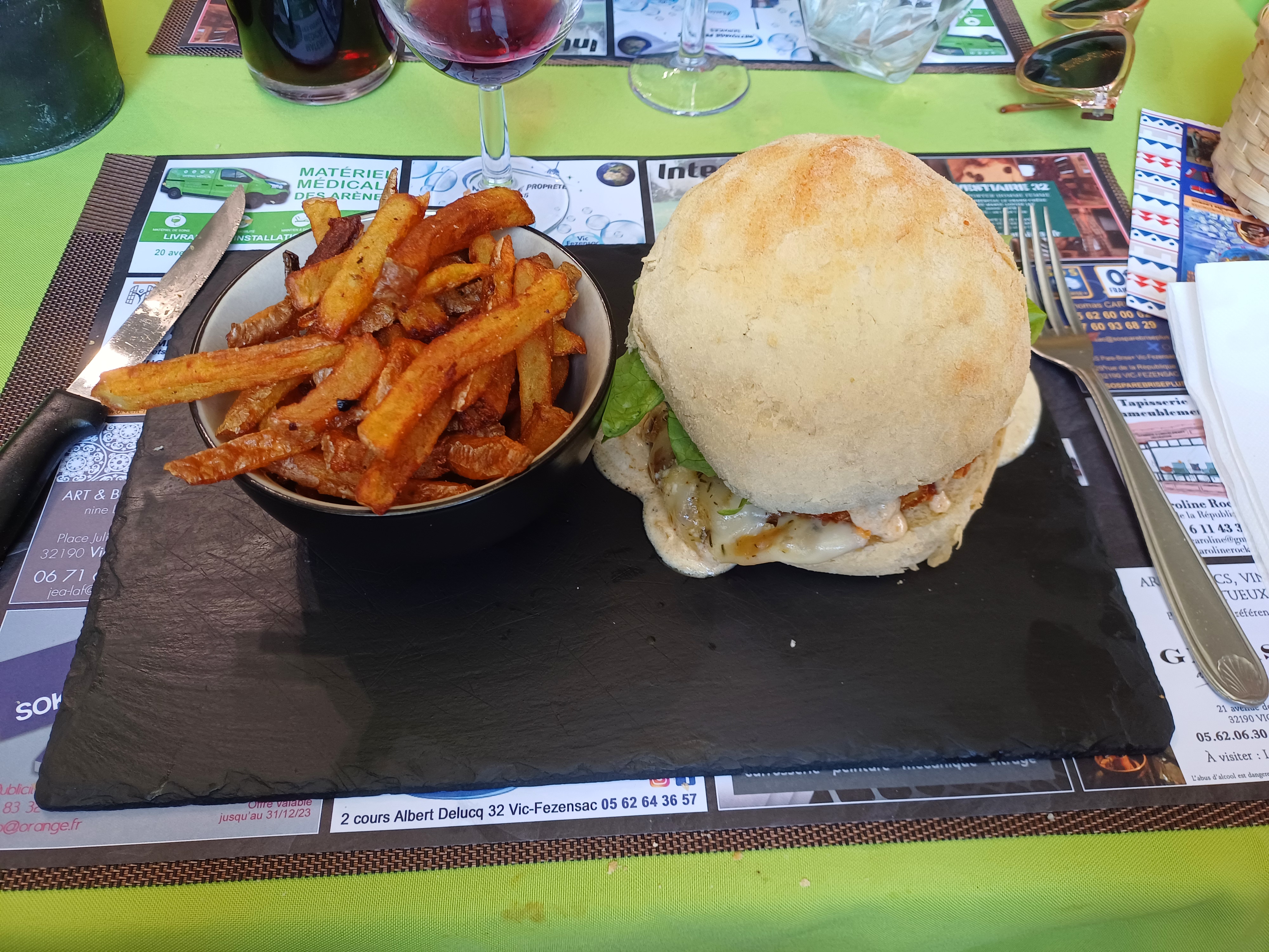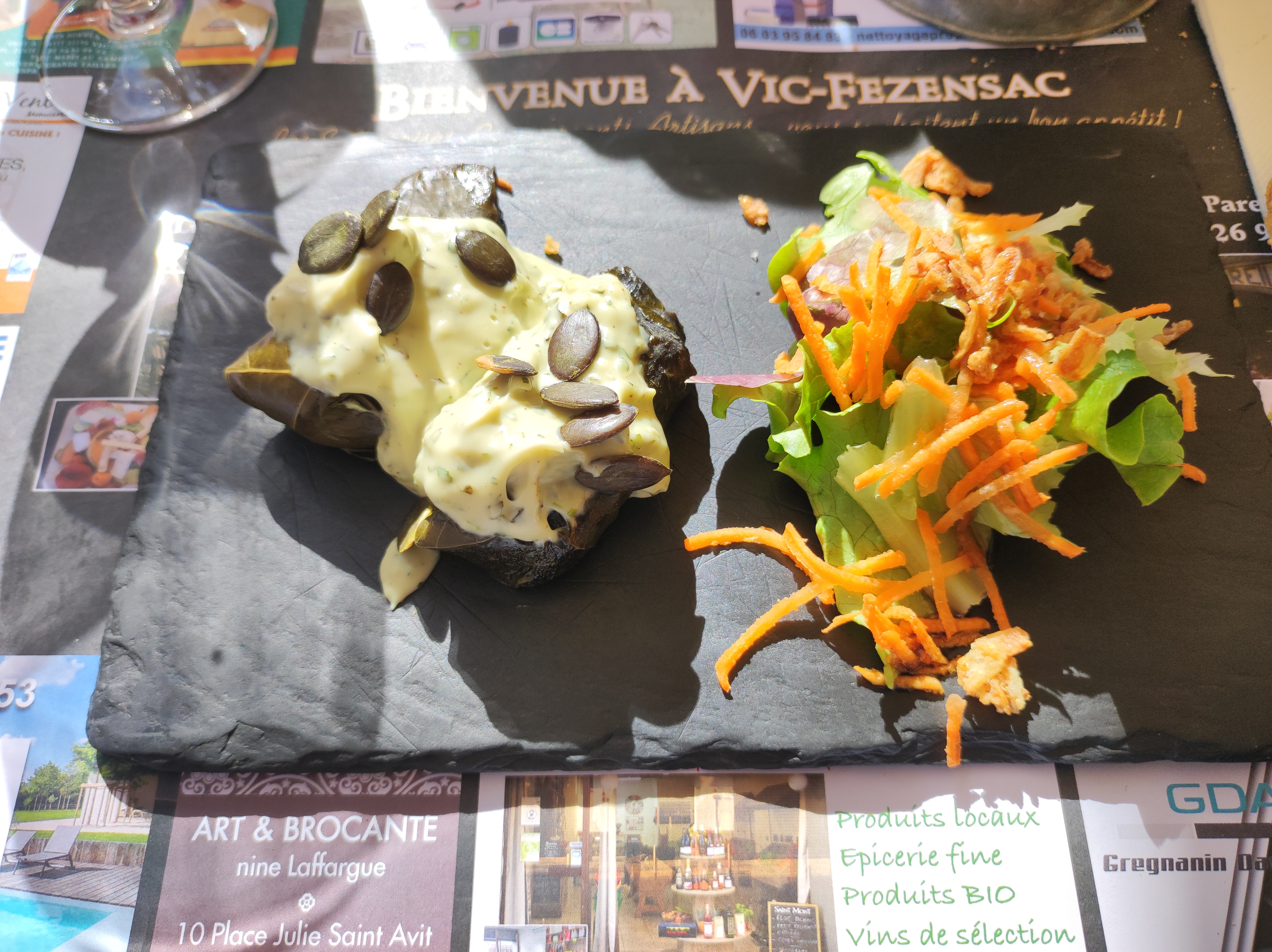 Un restaurant vraiment charmant. Nous avons visité vendredi, jour de marché à Vic Fezensac. Le menu était varié et offrait une excellente qualité à un bon prix. J'ai eu une fabuleuse salade de feta et chou rouge aux fruits des bois, un beau filet de saumon accompagné d'une salade de céréales mélangées et sauce vanille, (dont je n'avais jamais entendu parler auparavant, mais que j'essaie de recréer à la maison) et un glace aux fruits tropicaux pour le dessert. Mon mari avait une terrine qui avait l'air délicieuse ! Le serveur était très serviable, accueillant et sympathique. Nous y retournerons certainement l'été prochain !