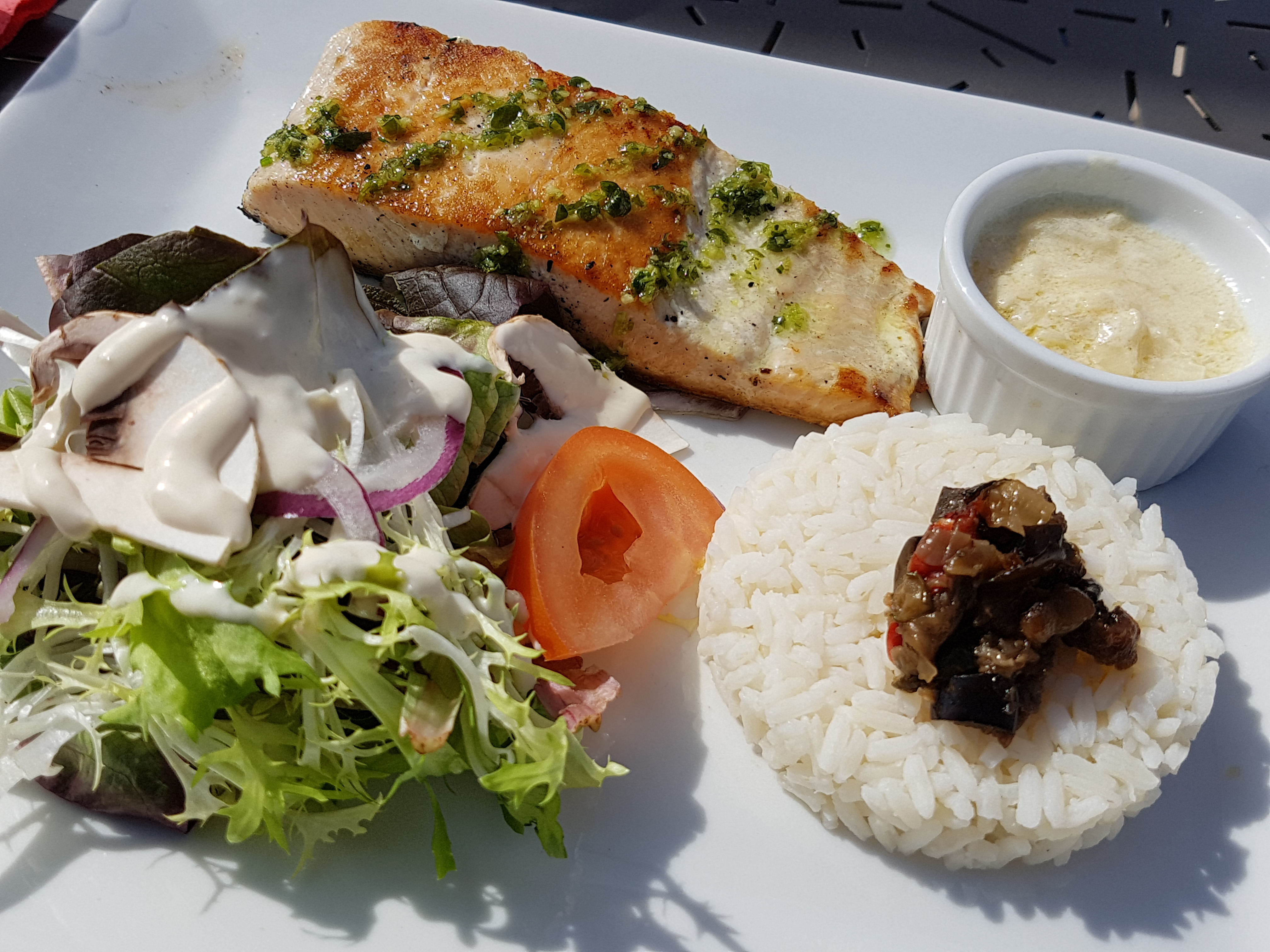 Le menu a 18,90€ donne envie avant de commander. On déchante vite quand on voit les plats arriver. J’ai pris une entrée “salade chèvre chaud” qui n’a rien d’exceptionnel, pas mauvaise mais bon, 3 feuilles de salade et la moitié d’un champignon, accompagnés par 3 petits “samoussas” de chèvre. Ensuite le plat: du saumon dur et sec mais bon pas étonnant quand c’est du surgelé. Cette espèce de poisson était accompagnée de riz (comme celui en sachet et pas assaisonné) puis de 4 bouts de courgette et d’une feuille de salade. La sauce qui allait avec le saumon était aussi décevante que le reste. Les salades repas sont également décevantes. 47 euros pour 2 personnes pour si peu de qualité, je ne conseille pas