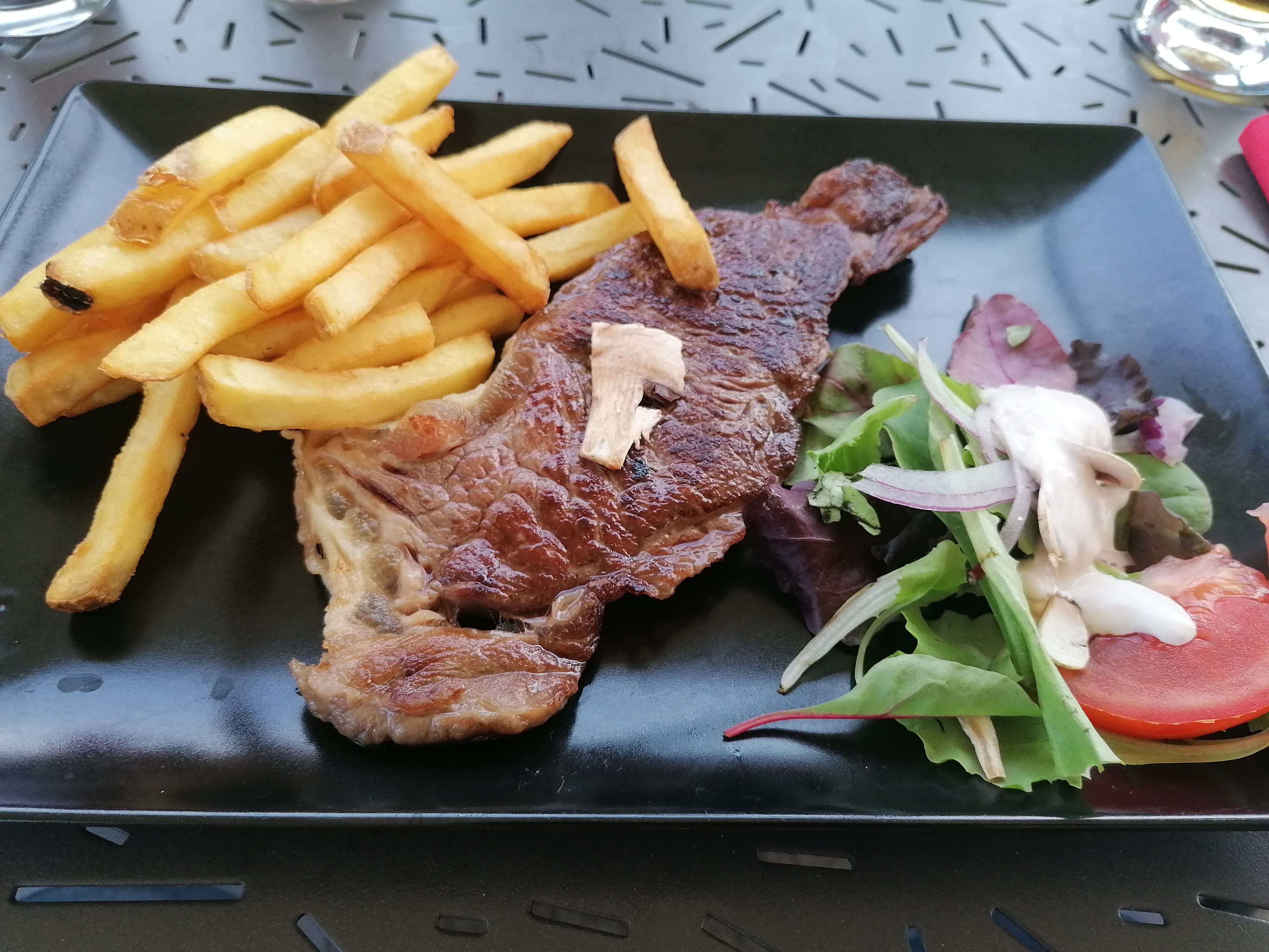 Serveur et serveuses agréables qui nous placent en terrasse ombragée où un filet d'air nous fait oublier les 37 degrés à 21h45. Boissons servient le temps de parcourir le menu. J'ai commandé un assiette de viande, une salade, et un menu enfant. Assiette de viande excellente, cuisson parfaite. Seul bémol mais c'est commun dans la région : des fumeurs qui ne se gênent pas de déranger tout le monde pour prendre leur dose.
