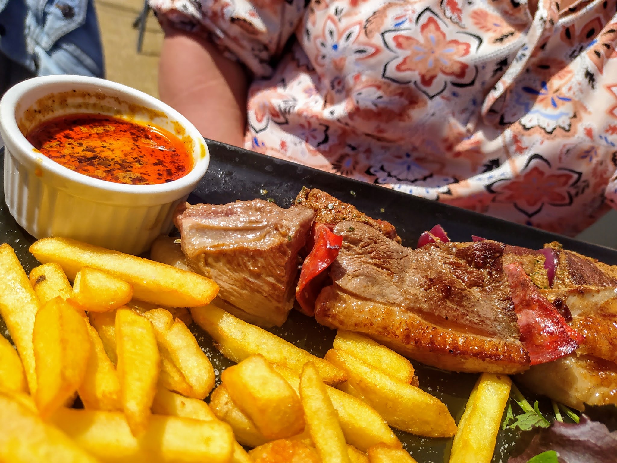 Très déçus ! Nous avions choisi cet endroit selon les notes mais quelle surprise ! L'entrée était bonne, la brochette de poisson un peu trop cuite mais bonne, mais la brochette magret et boeuf n'était pas saignante comme demandé et la viande avait un goût bizarre, frites molles, sauce au chorizo qui n'a qu'un goût de gras. Et en dessert île flottante difficile à couper à la cuillère, au lieu d'être légère ! Tiramisu sans goût de café. Nous avons été très déçus de notre repas. Dommage.