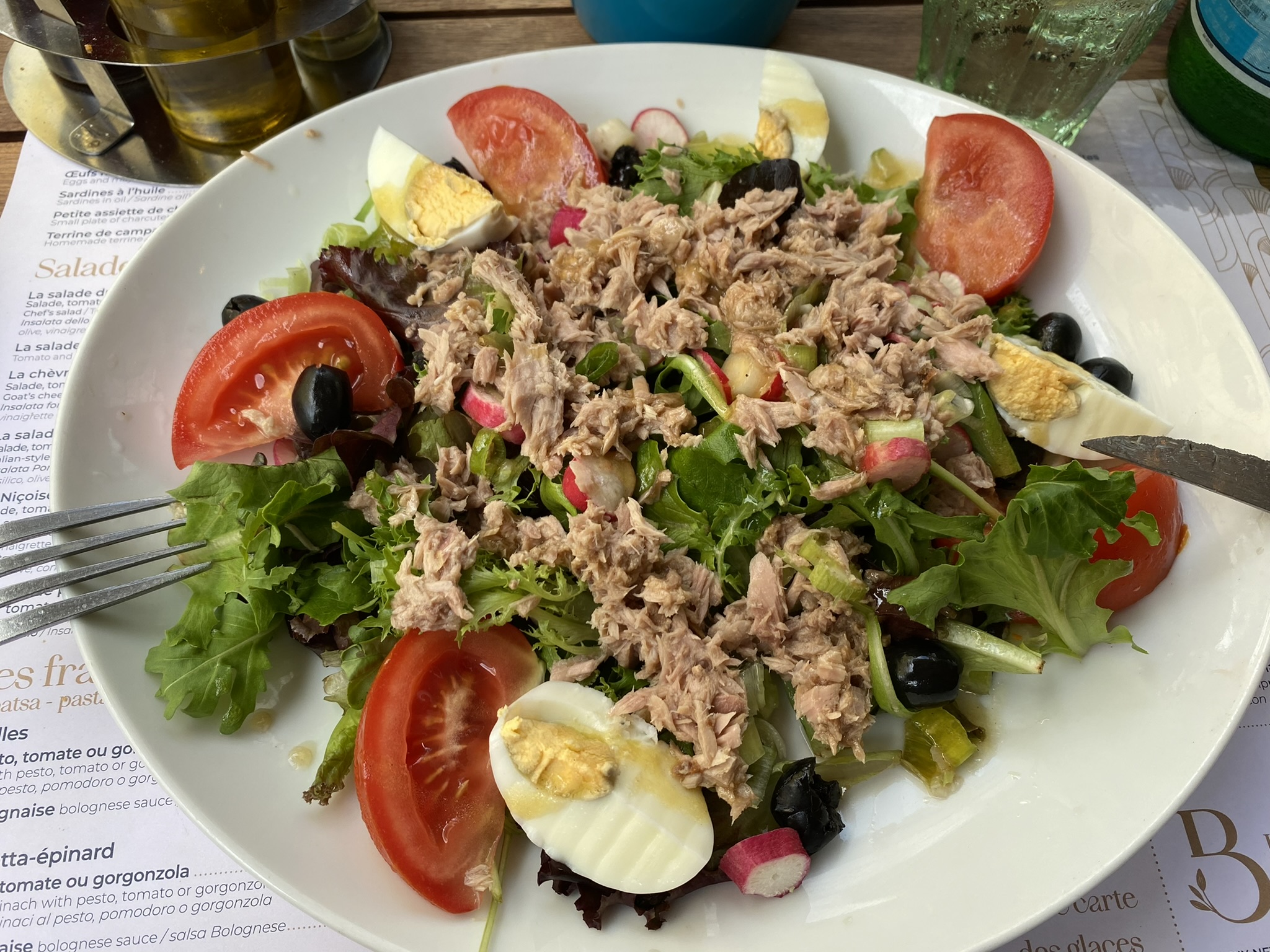 Nous avons eu quelques rafraîchissements et une salade niçoise. La salade n'était pas classique, pas de pommes de terre par exemple, mais elle était copieuse, fraîche et savoureuse. Mais le plus étrange. Lorsque nous avons payé notre facture, nous avons reçu trop de monnaie. Nous sommes allés au comptoir du bar pour rendre les 10 euros supplémentaires, mais la serveuse s'est fâchée. Pourquoi tu te plains à moi, s'écria-t-elle. Heureusement, les autres membres du personnel se sont dépêchés de sauver la situation, mais il n'est pas nécessaire de demander si nous revenons dans ce bar.