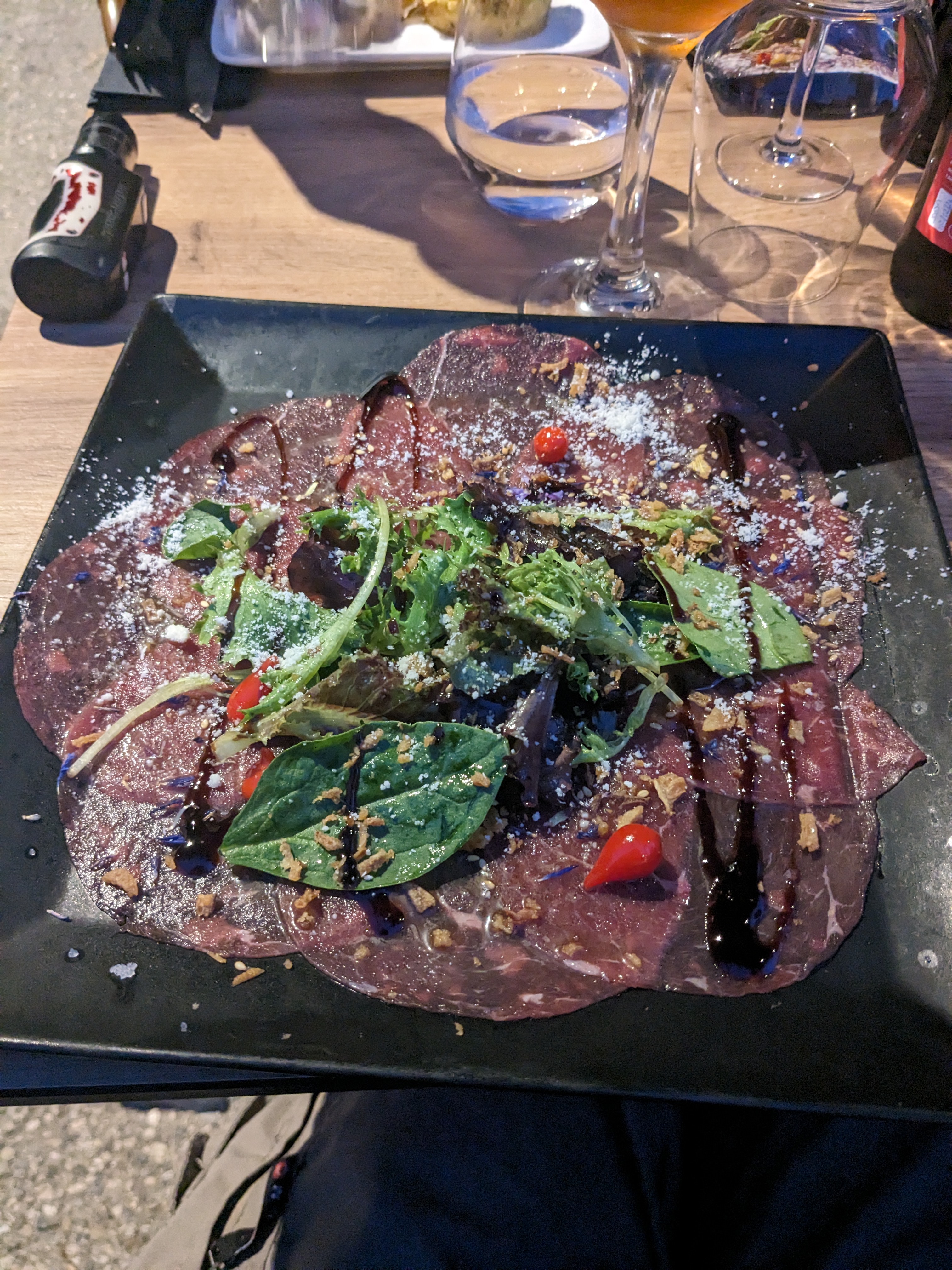 J'ai mangé ici ce soir. Il n'y avait pas beaucoup de monde et le restaurant était ouvert tard. C'était difficile de faire une réservation même s'il n'y avait pas beaucoup de clients. Alors pourquoi rendre les choses difficiles ? La nourriture n'était pas mauvaise, mais préparée avec beaucoup plus de passion et d'imagination que les fois précédentes. C'était surprenant à l'époque. Maintenant très simple. L'entrée était ridiculement chère. Assiette de charcuterie, 5 tranches, du supermarché pour 10 €. Les plats principaux sont également trop chers. Qualité prix. Je dirais de mettre vos épaules au volant et d’offrir de la qualité avec passion et imagination.