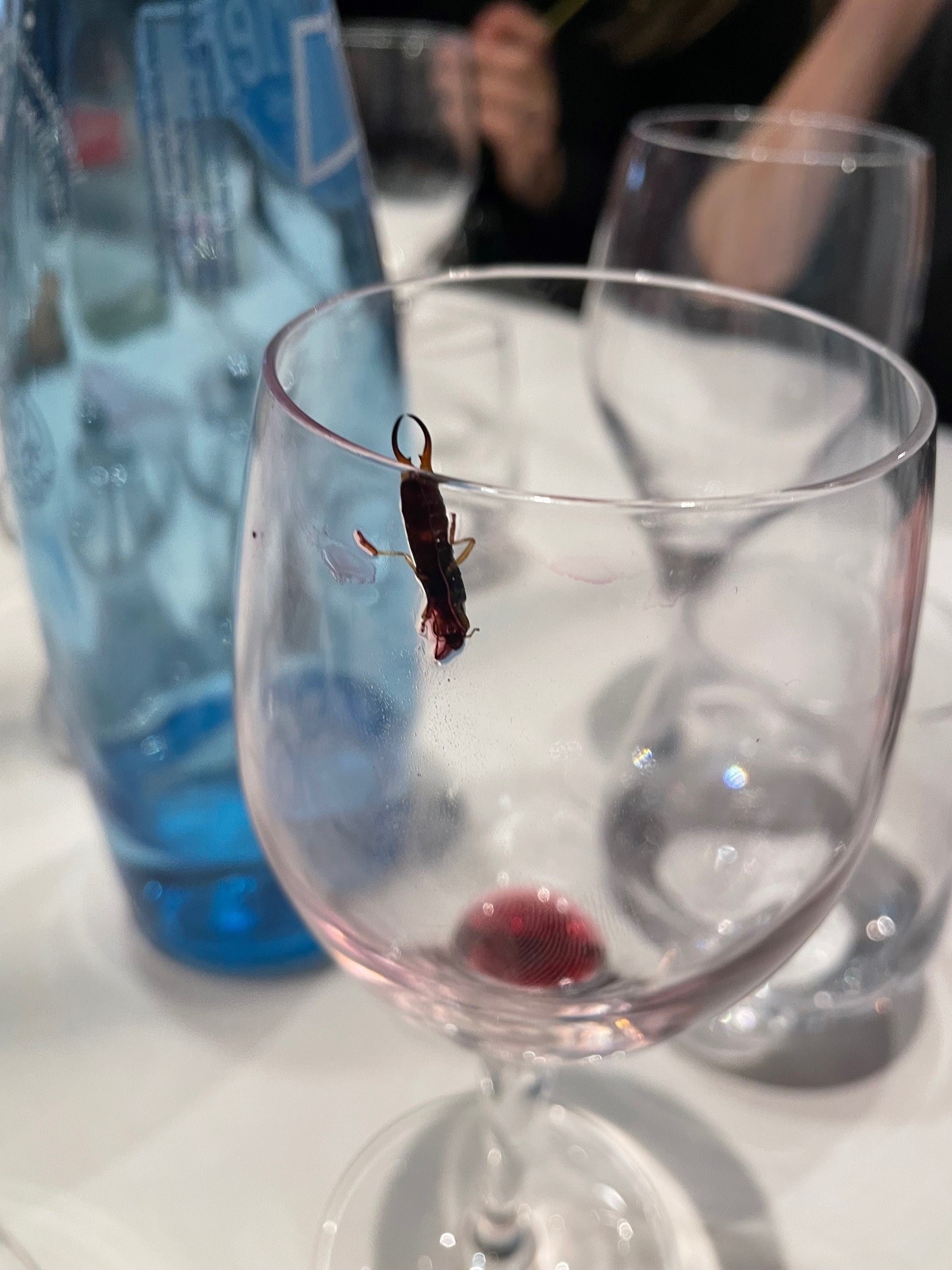 Comportement lamentable ! Un pince oreille était dans la bouteille de vin rouge Je vous laisse imaginer la sensation en bouche! Le seul commentaire du serveur a été « c’est la première fois que je vois ça » mais comme nous avions consommé la bouteille, il n’a voulu faire aucun geste commercial à ce titre ! Au regard de la renommé de l’établissement, je trouve ce comportement déplorable pour une note de 366€ pour 10 personnes. Pour information: Déjeuné du 25/11/21 à midi
