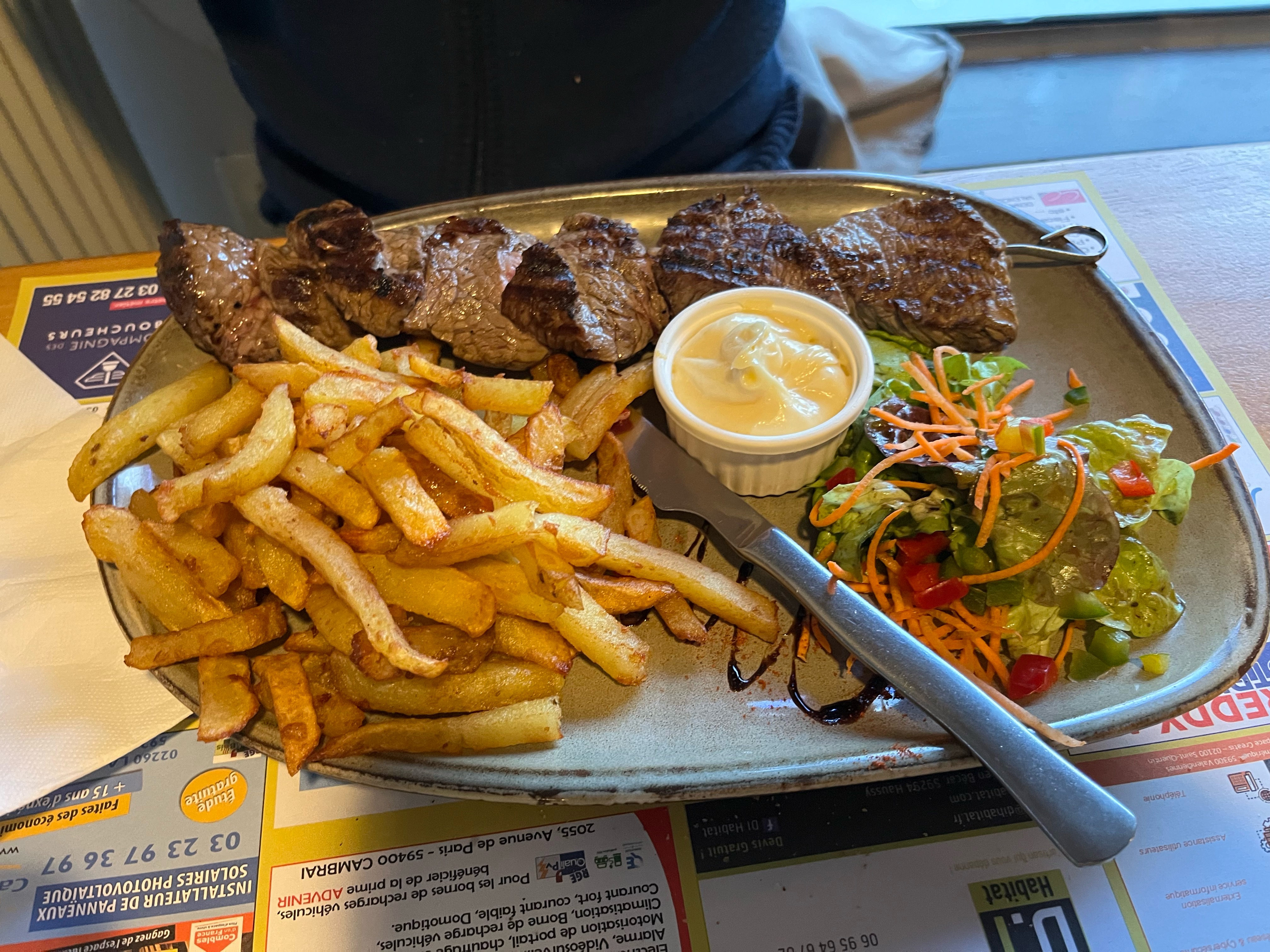 Je suis venu ici manger avec mes collègues d'Auchan, je ne connaissais pas mais franchement j'ai très bien mangé ! La viande est excellente, les frites exquises et la sauce au maroilles 👌👌 Personnel à l'esprit commerçant et très sympathique je ne peux que recommander 👍👍