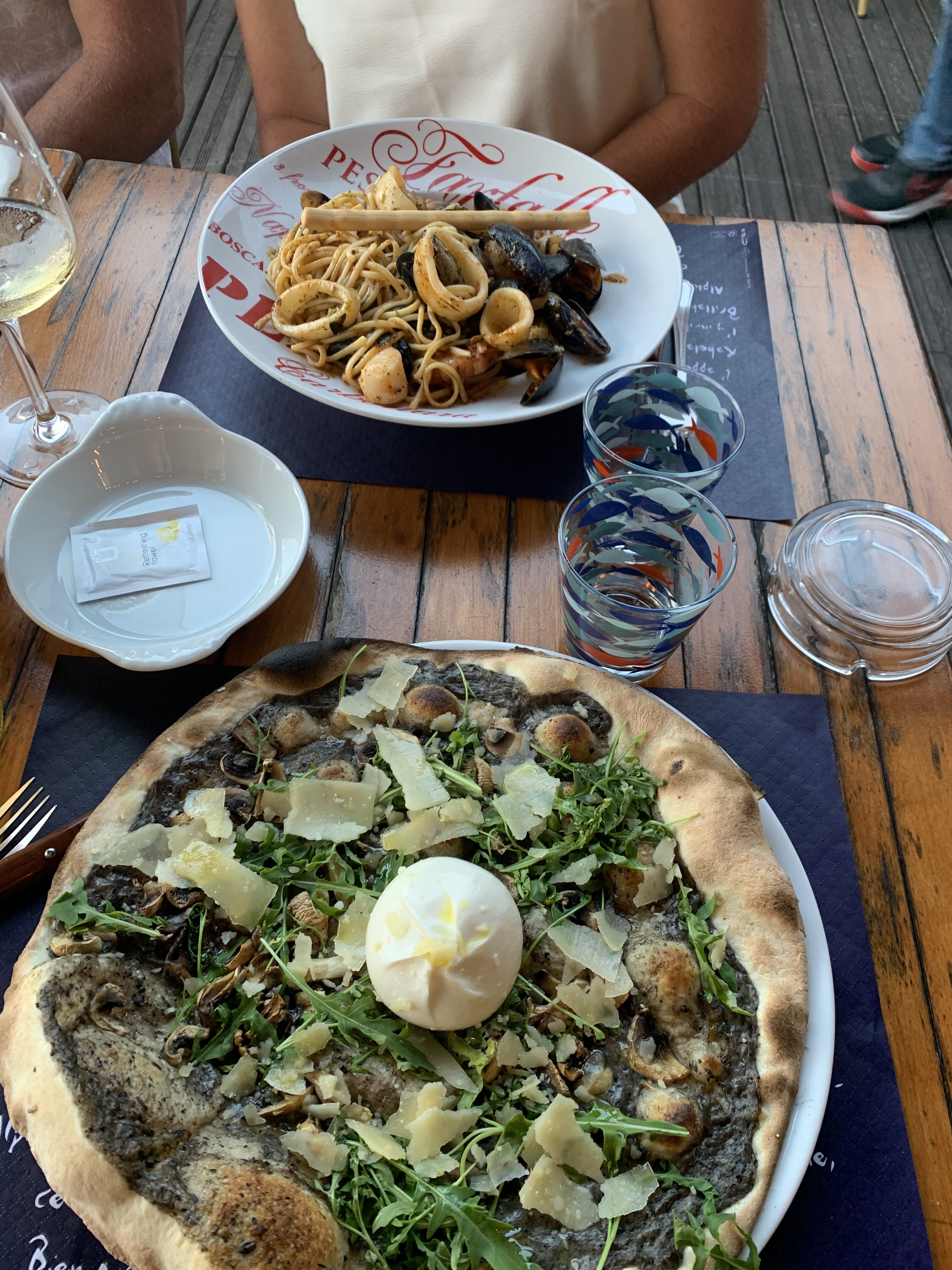 Nous y avons mangé deux fois.. une fois pizzas très bonnes et deuxième fois des plats pour ma part linguine bolo que je n ai pas du tt apprécié car pas de viande juste l impression d avoir des pâtes au concentré de tomates et une autre personne a pris linguine fruits de mer ou les coquillages se melangeaient aux pâtes.. je recommande pour les pizzas simplement
