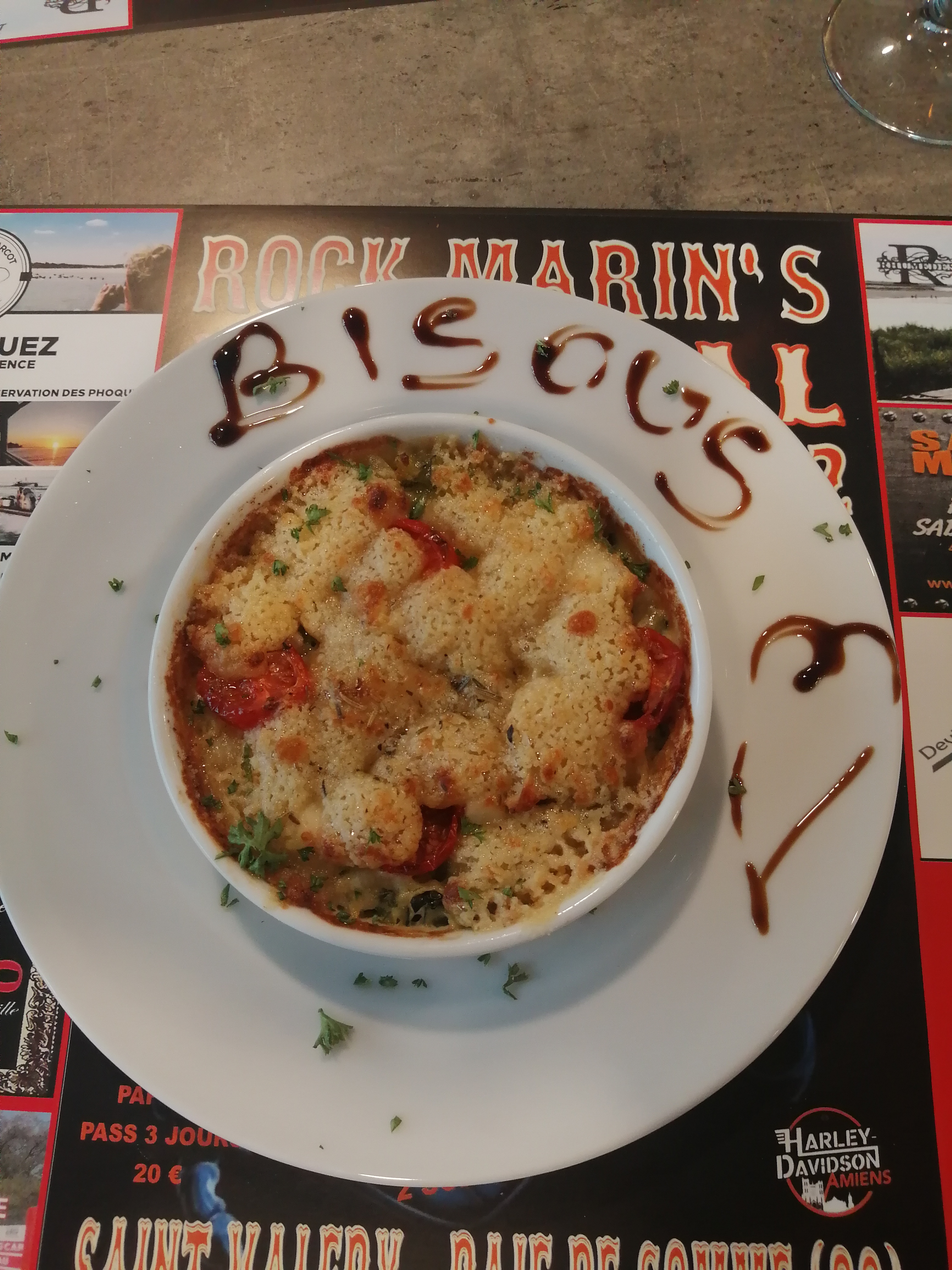 Nous avons mangé duo de poisson et cabillaud en cocotte.cuisson du poisson parfaite servie avec des pommes de terre à l eau, bien cuites aussi et une très bonne sauce.tarte tatin maison.cuisine sans fioriture mais de qualité à 5km de Saint Valery sur somme avec restaurants attrapes touristes.un petit détour pour bien manger avec des produits de bonne qualité. Je conseille