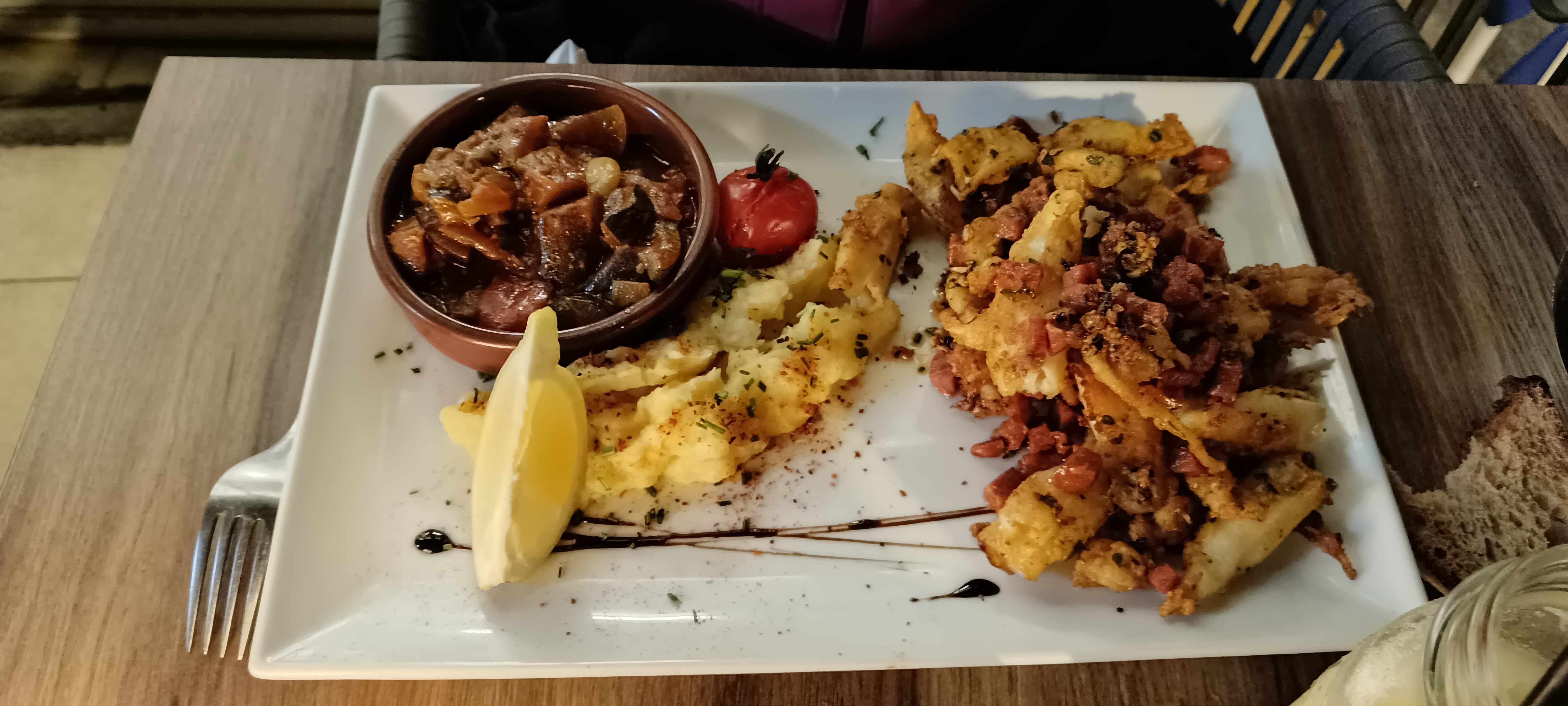 nous devons relancer pour prendre commande, 20 min plus tard, le serveur arrive, et il a oublié un élément essentiel : le sourire. Nous commandons des boissons et menus. Le plat arrive 15 min plus tard, mais seulement 2 sur les 3 et en plus nous n’avons même pas nos boissons, un serveur toujours froid et qui se le perdu… J’ai mon cocktail mais qui est amer, quand il m’amène le plat: je lui en fait part, il me répond que ça doit être le gin qui fait cette amertume : aucune solution apportée… Pour le dessert, un sketch, je suis obligé de faire de grands signes en levant les bras car il passe comme une flèche devant les tables : sans un regard envers les clients…