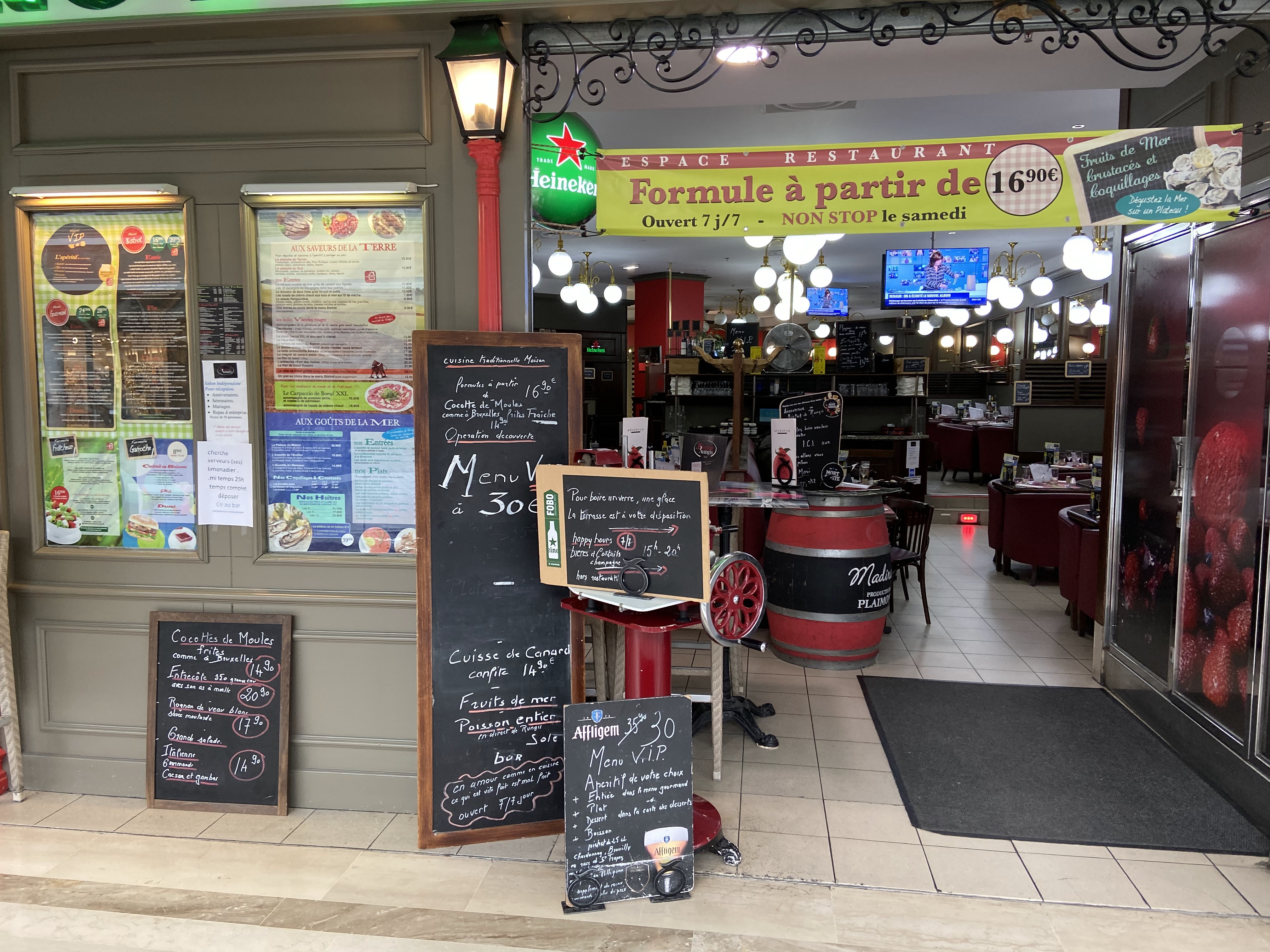 Nous y sommes allés pendant 3 semaines et deux jours avant la fin de notre chantier le serveur nous offre une bière sachant que tout le temps ou nous y avons été, nous avions des factures journalière de 120 euros environ, nous acceptons les deux bières offertes,nous trouvons cela sympa car ce n'est pas une chaîne de restauration,ce que nous privilégions le plus possible.mais à l'arrivée les deux bières nous ont été facturé, c'est sûr que nous n'allons plus y mettre les pieds,demain nous irons en face même si cela est une chaîne,sachant que l'on doit de nouveau revenir pour un chantier de trois semaines dans la galerie,ils ont perdu au minimum 5 couverts jours et consommation au bar