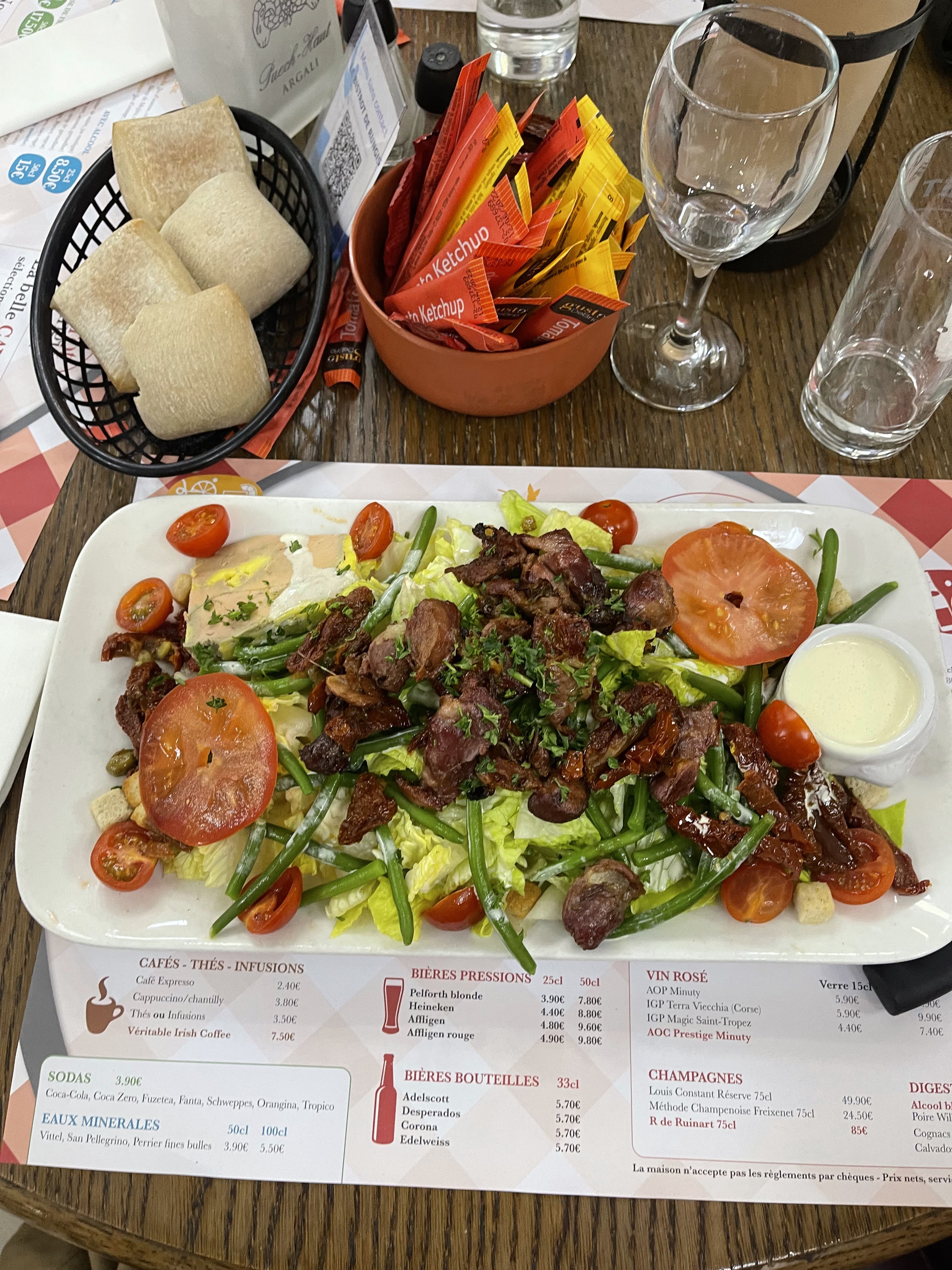 Pas trop mal, mais bon les frites sont pas maison, le camembert du menu a 18,50 la salade un peut noircie, le camembert un peut juste, mais bon cela reste correct, mais j’y retournerais pas pour autant