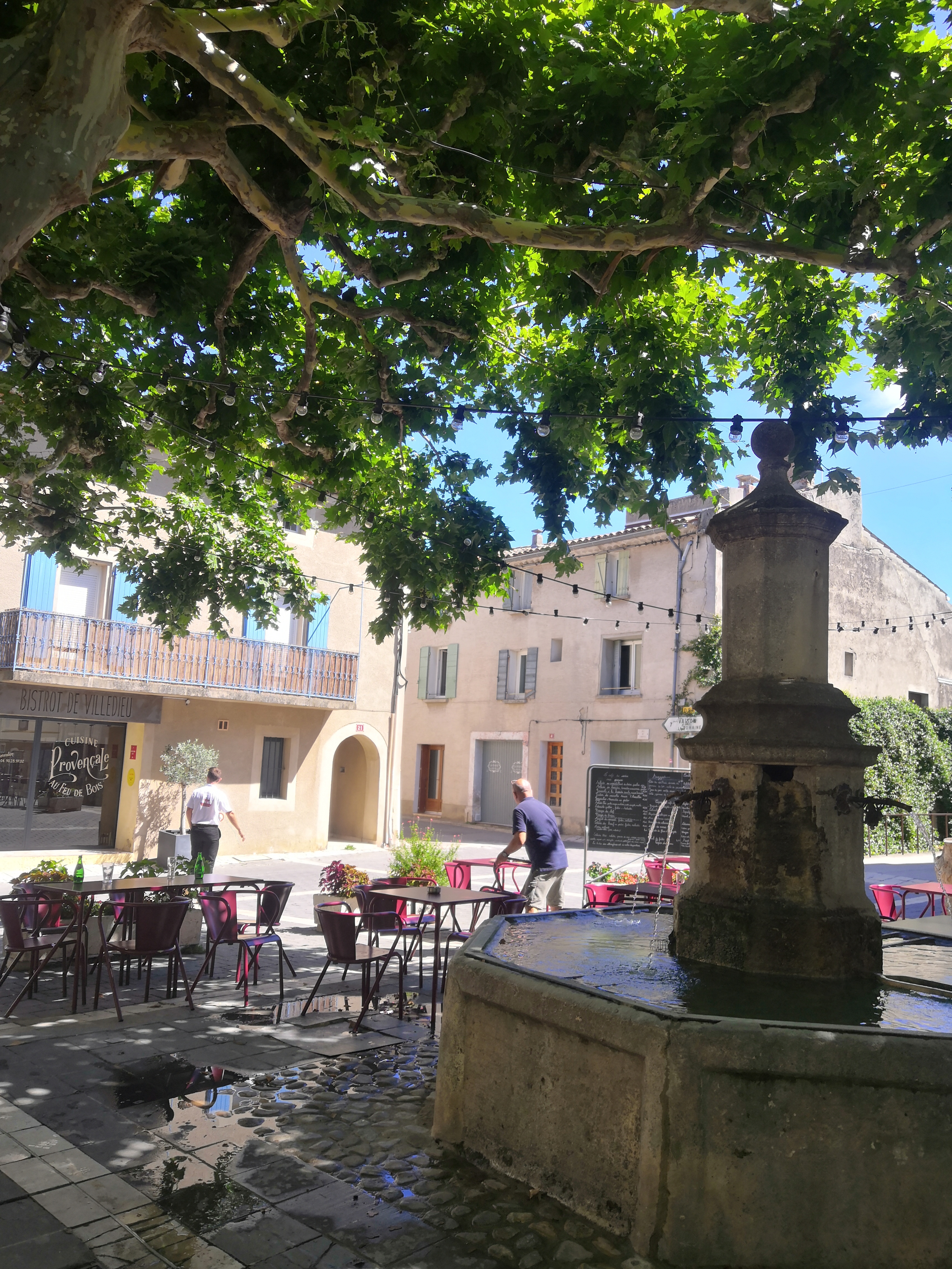 Très belle place de village médiéval très ombragée bon services patron très sypa