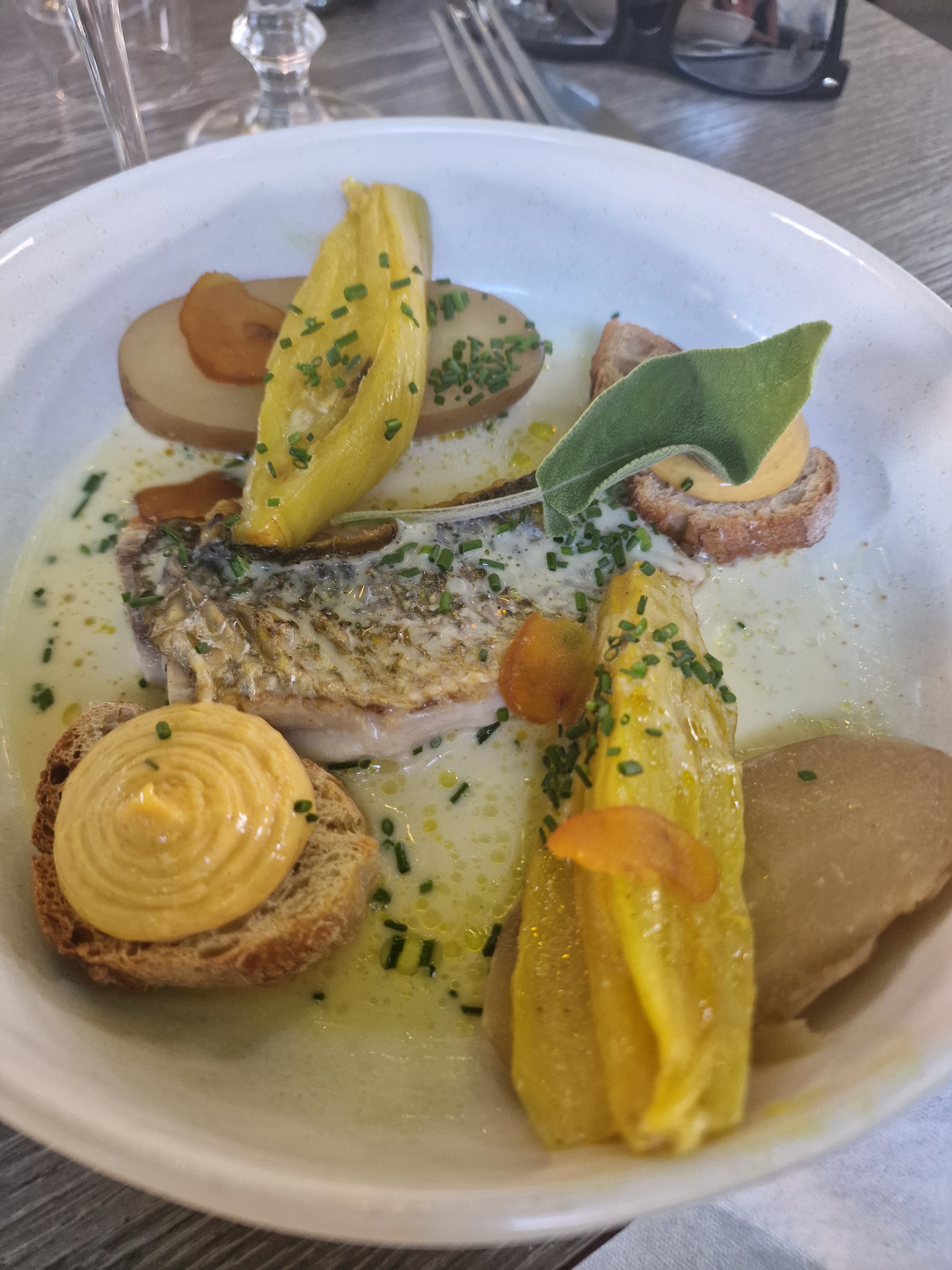 Succédant à la sympathique Pizzeria la Maison Bleue, cette table mérite vraiment le détour : cadre top sur la place du village, l’entrée très intéressante foies et gésiers de volaille aux lentilles à découvrir sous une mousse légère et aïoli sans faute cuisson parfaite des légumes, servi à température impeccable, sauce de caractère. Petit bémol concernant l’affinage ´locavore ´ car le cabillaud ne vient sûrement pas de Méditerranée contrairement à l’affirmation du serveur … mais le reste de la carte est compatible avec l’utilisation de produits locaux. .le prix est correct au vu de la qualité de l’assiette.