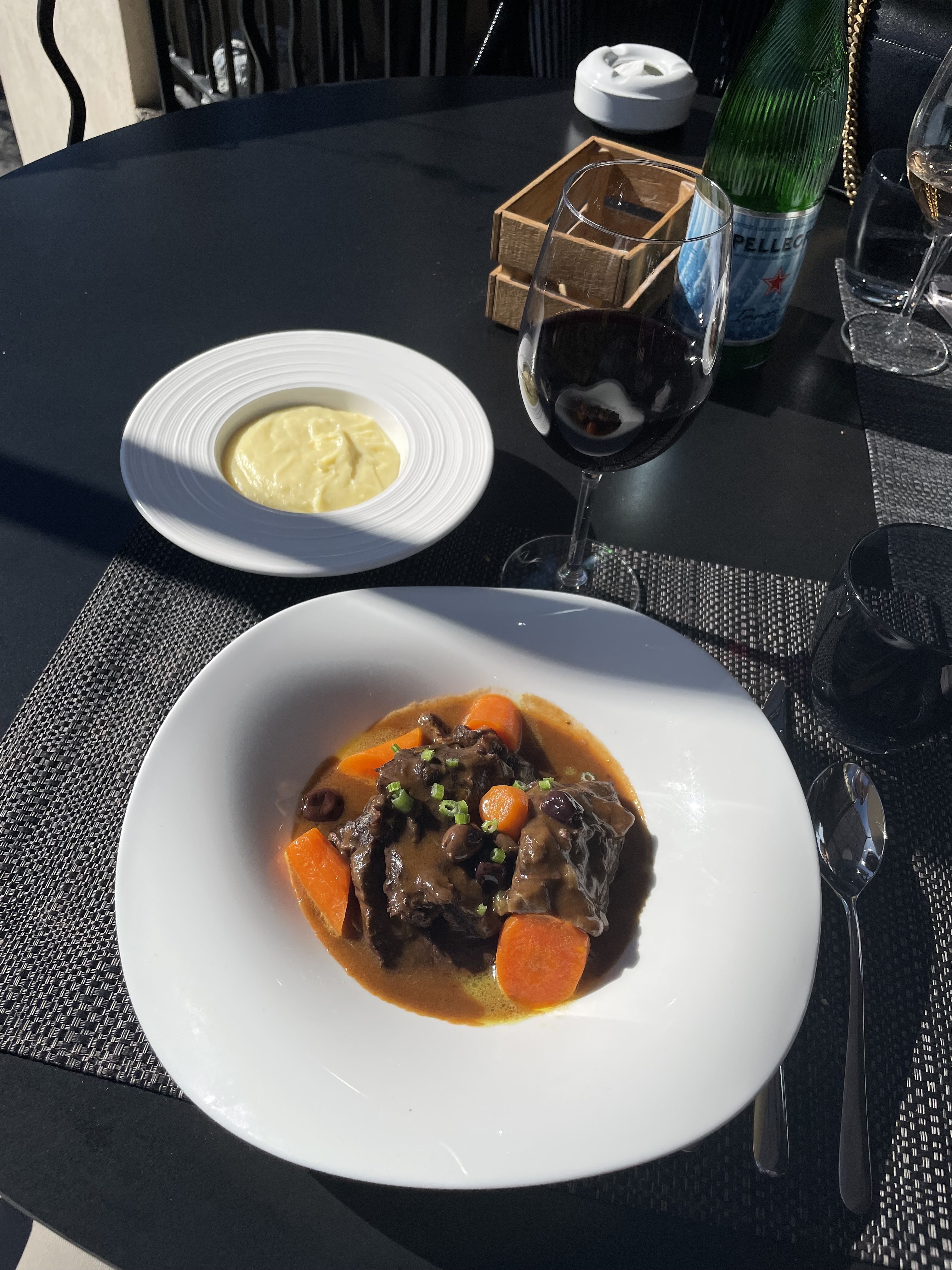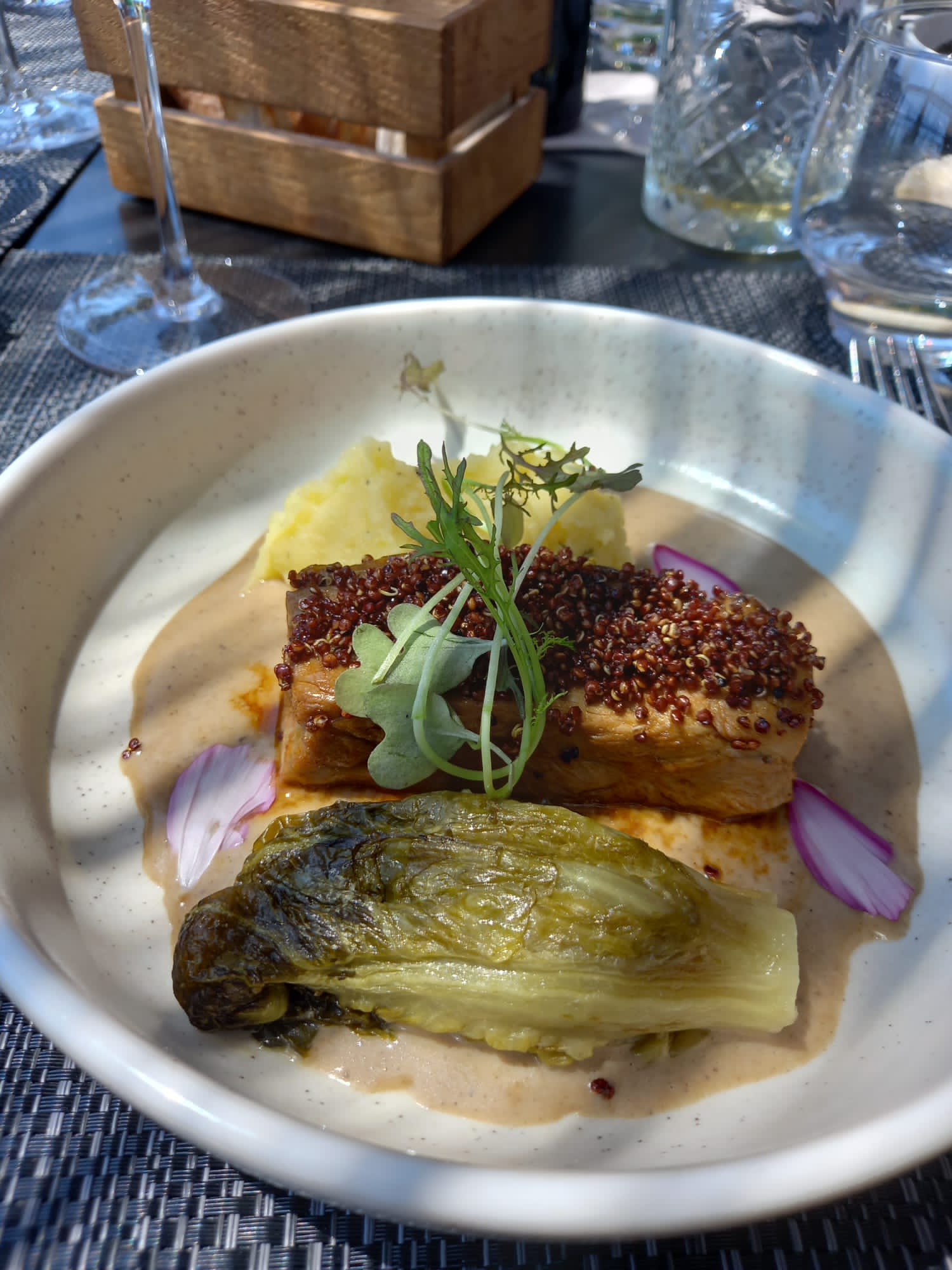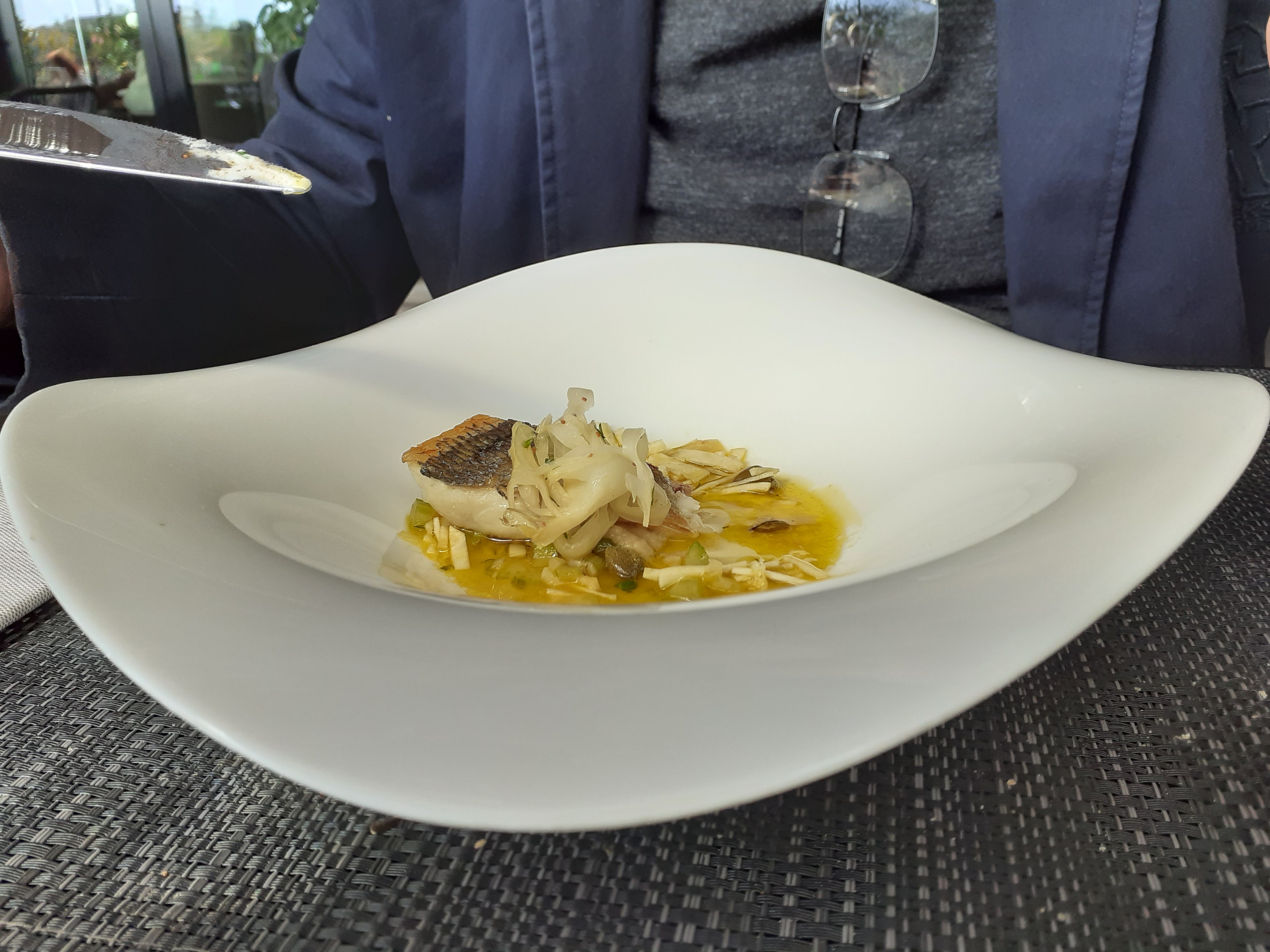 Mets très fins de l'entrée au dessert accompagnés d'un vin blanc au verre bien servi. Terrasse agréable en cette journée exceptionnellement ensoleillé. Très agréable moment.