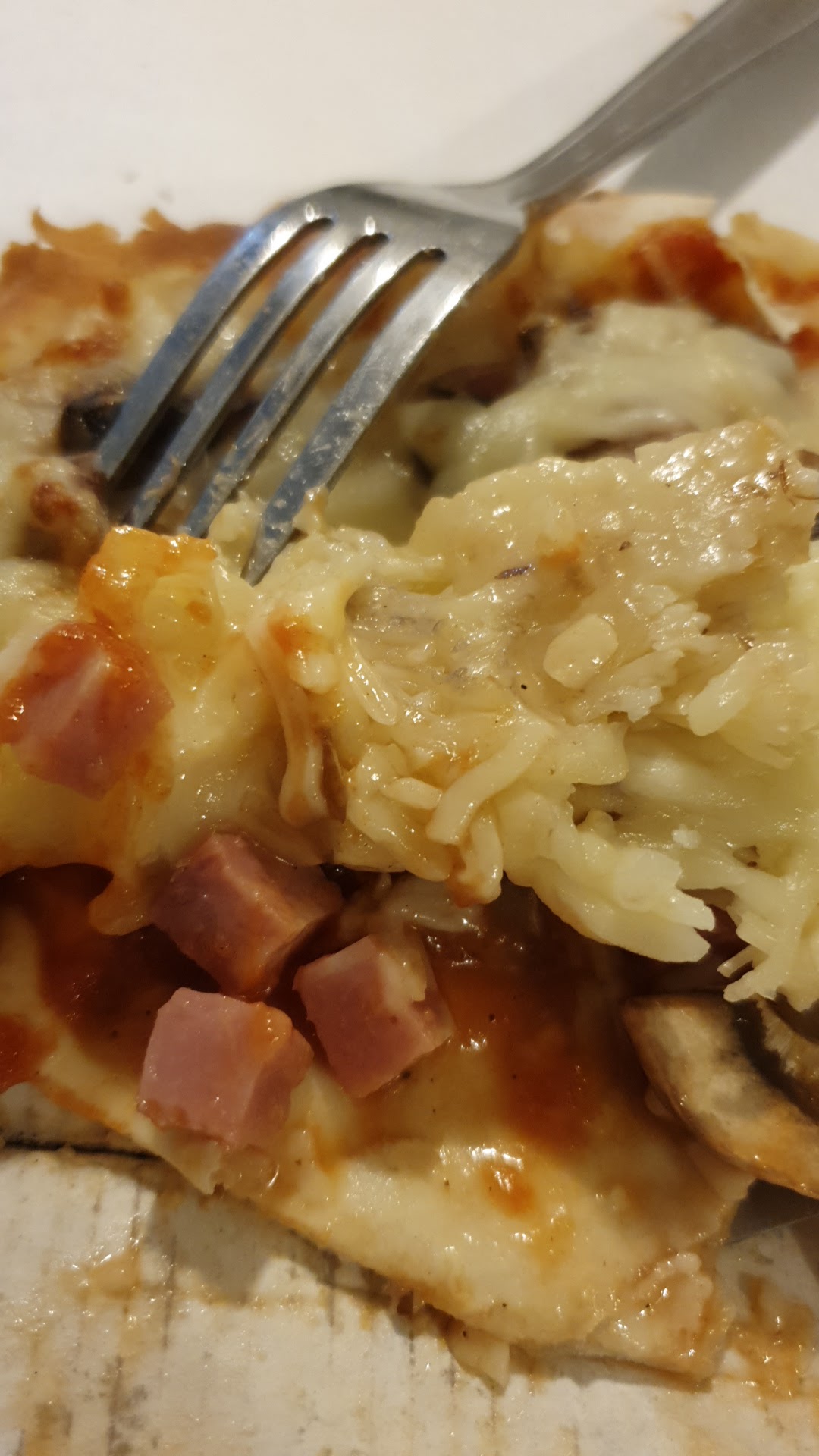 Déconseille.... fromage non fondu, dés de jambon style super marché.... pâte non cuite et surtout froide ce qui signifie que la pizza est soit mise au frigo soit décongelé ce qui explique aussi le fait qu'il y ait un jus qui coule étrangement. Franchement je ne comprends pas les commentaires qu'il y ait eu avant 👎🏻