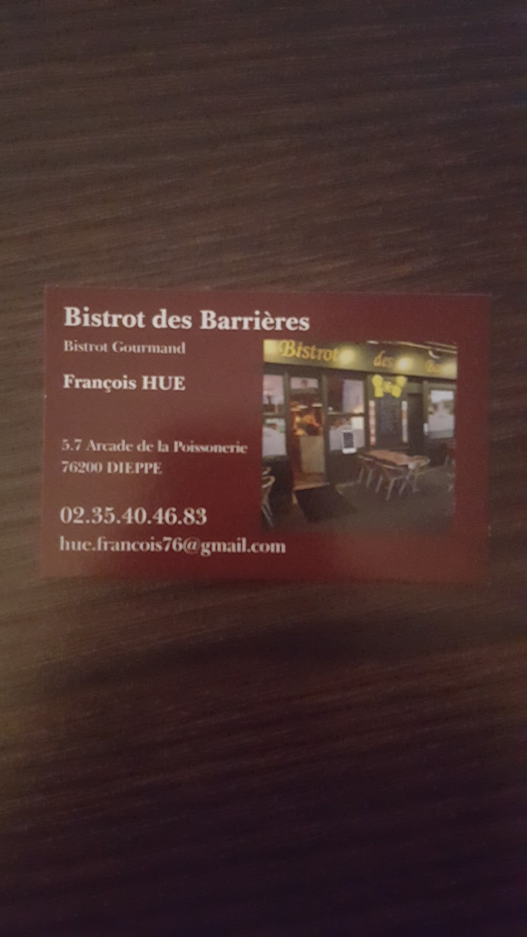 Voici toutes les informations sur le Restaurant français Le Bistrot des Barrières qui ce trouve au 5 Arc de la Poissonnerie, 76200 Dieppe (76). Sur cette fiche vous trouverez les photos, l'adresse, les horaires d'ouverture, le numero de téléphone et les avis clients.Vous pouvez églement rédiger un avis si vous le souhaitez en bas de page.
