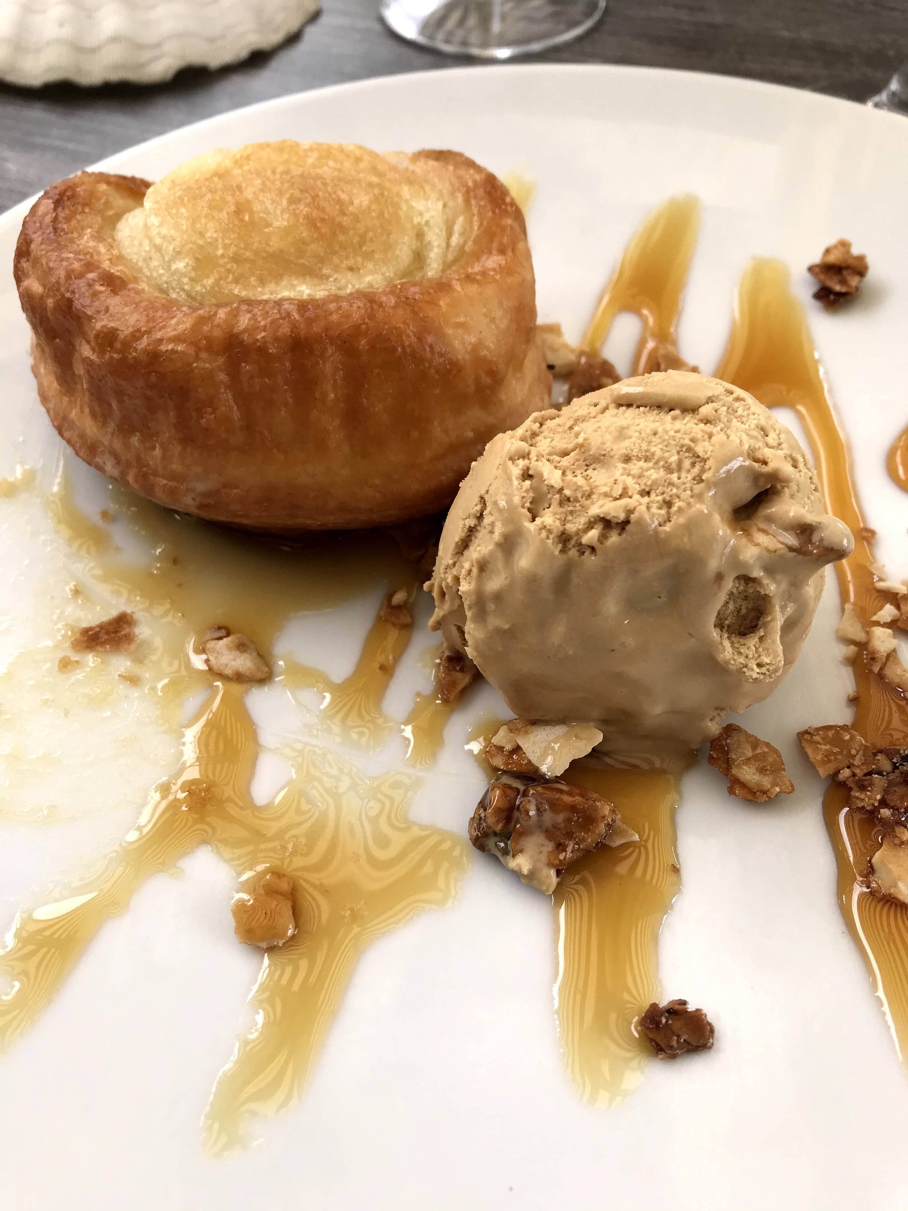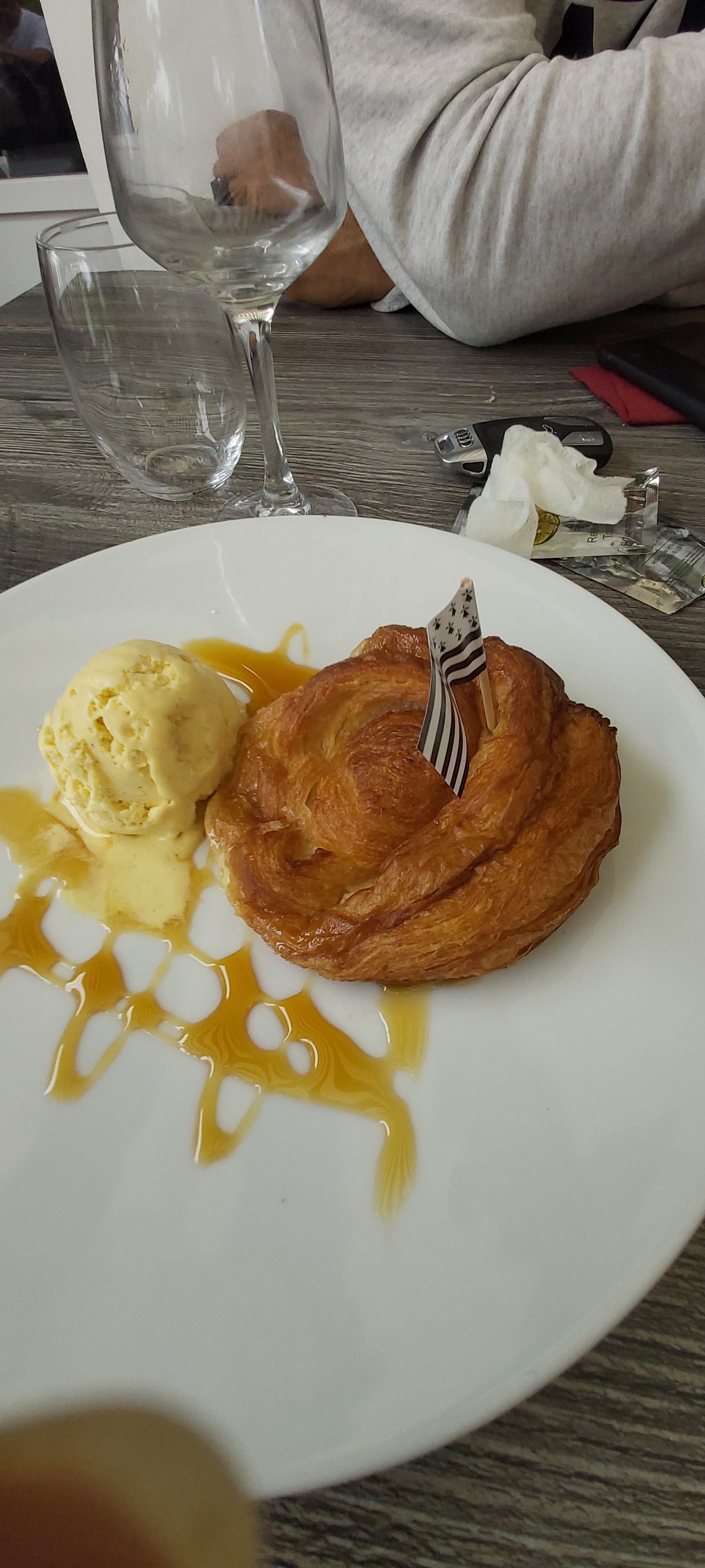 INCONTOURNABLE!! Meilleur Kouign-Amann de Bretagne! Nous avons déjeuné là par hasard, un midi d’août. Petite terrasse sympathique, et surtout un personnel particulièrement agréable et attentionné, souriant derrière le masque de rigueur, et ce malgré une saison touristique déjà bien entamée, et particulièrement chargée cette année! Je le note parce que c’est vraiment appréciable. Nous avons mangé de délicieuses moules frites, et une brochette de noix de Saint Jacques excellentes, cuites à la perfection. Pour finir donc, le fameux Kouign-Amann maison, très moelleux et servi tiède avec une boule de glace caramel... un DÉLICE!! Une crème brûlée à l’orange maison, parfumée, délicate. En résumé un délicieux repas! À ne pas louper donc! Sièges bébé à disposition... et caffé Lavazza!!