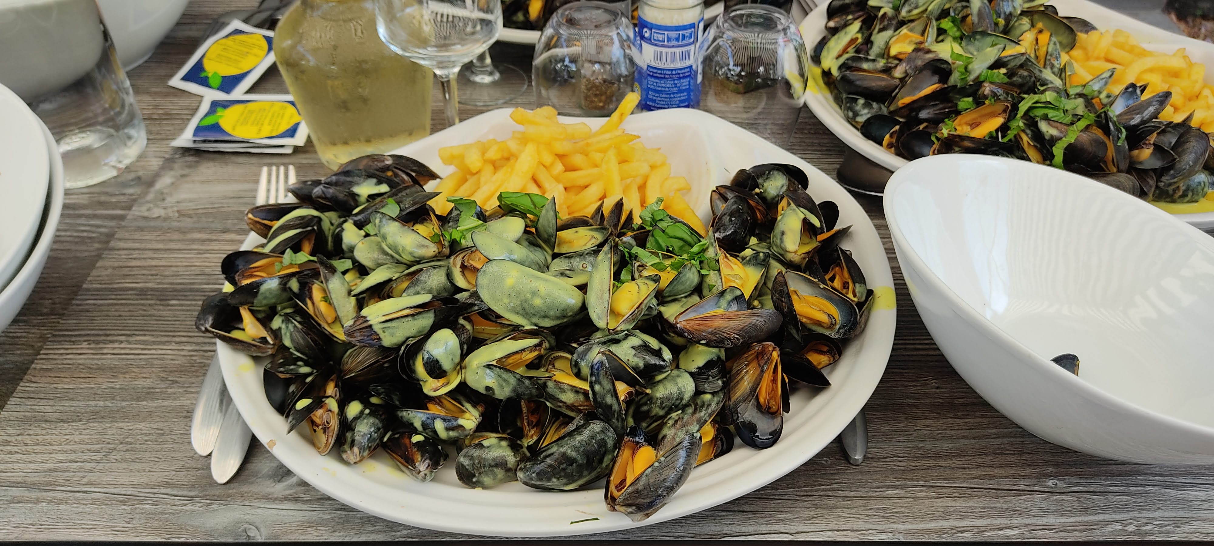 Les moules frites superbes et vous en avez dans l'assiette... Les travaux d'aménagement des sanitaires pour les pmr doivent être faits à la fin de la saison et en attendant le patron vous aide pour y accéder