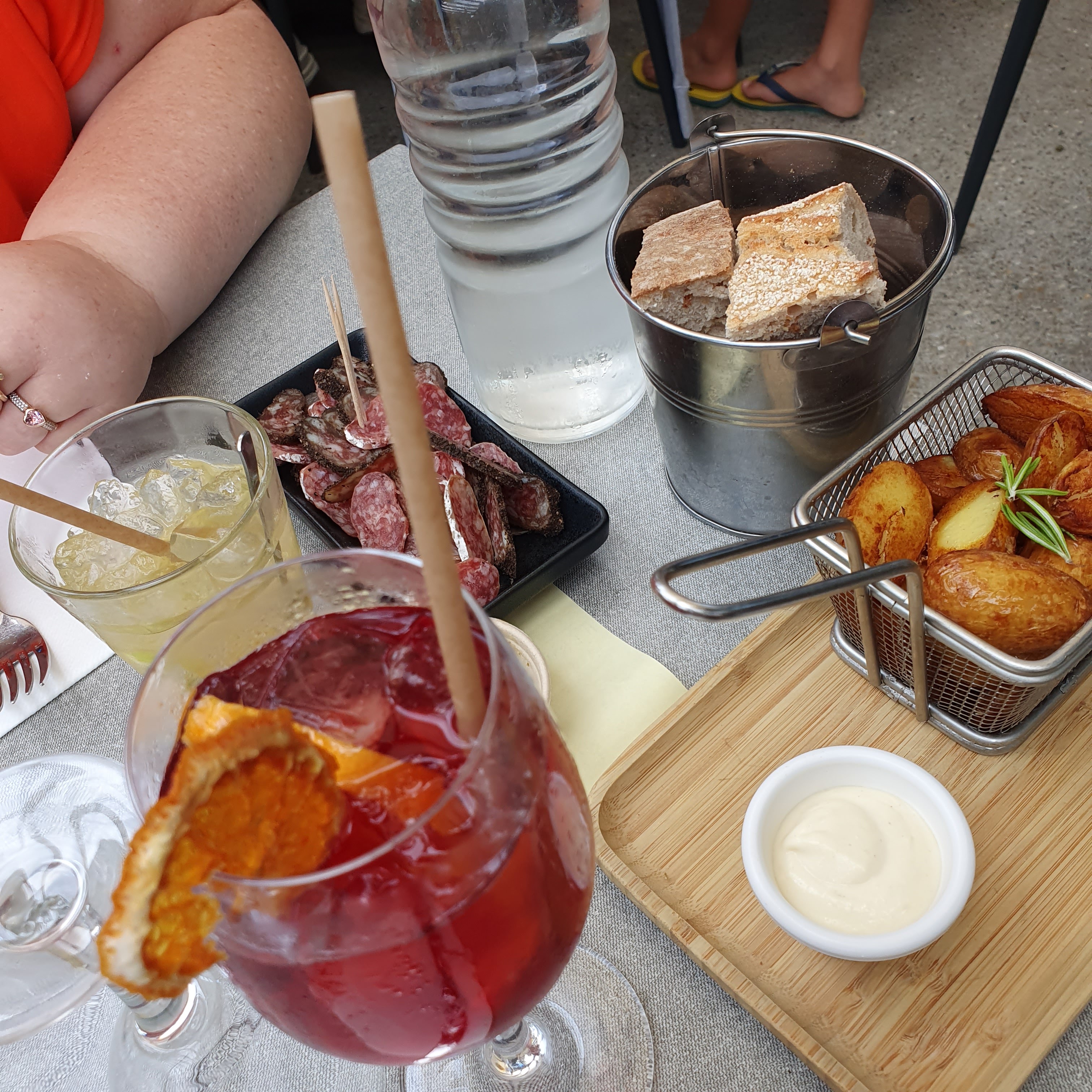 Endroit vraiment sympa avec de belles tables à l'extérieur. Les boissons étaient bonnes et les tapas étaient vraiment bonnes (surtout le poulet). Service très rapide. Nous avons dû attendre un peu pour attirer l'attention de quelqu'un pour payer l'addition mais ce n'était pas grave, dans l'ensemble, excellent 👍