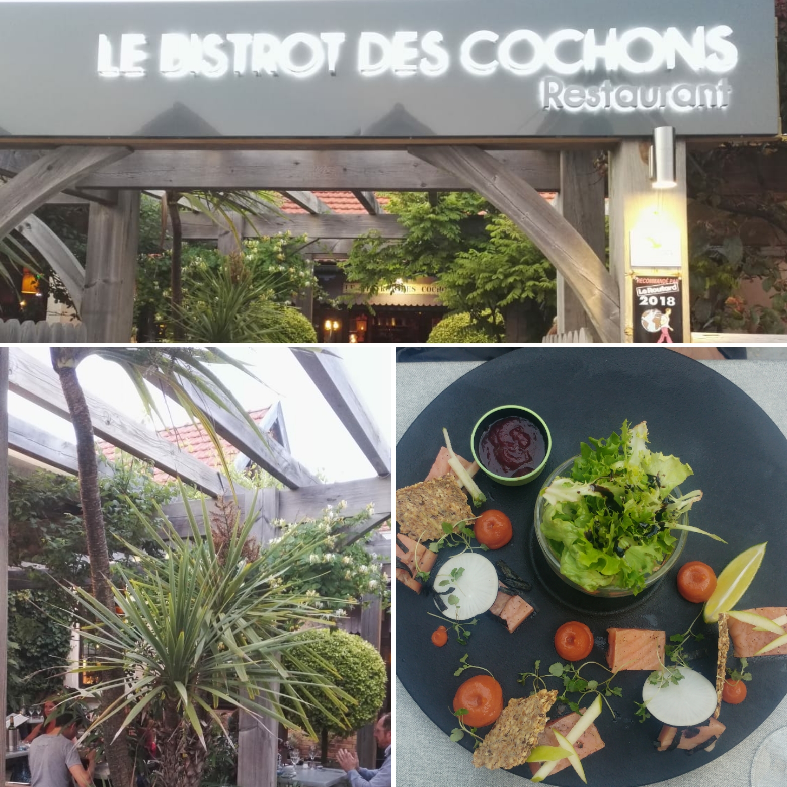 Superbe cadre (la terrasse est magnifique). Service efficace, meme en mangeant au premier service je n'ai pas eu la sensation d'être poussé pour laisser place au deuxieme donc hyper agréable ! Erreur sur la facturation, rappelé le soir même par le/les gérants pour convenir d'un rdv pour récupérer le trop perçu (hyper honnete) Cocktails très bons, j'ai été ravi par le rouget et sa sauce Nem, entrée que je prends depuis des années (ne le retirez surtout pas de la carte!!!), mes convives ont adoré le bao burger et le risotto de coquillette. Pour ma part les brochettes de canard était très bonnes, peut être une toute petite amélioration a faire sur la sauce coco/cacahuette pour la renforcer un peu en caractère (peut etre plus de satay dans la sauce pour relever) Desserts généreux et appréciés (le moelleux au chocolat a conquis tout le monde à table). Bref, nous avons passé un super moment, merci encore et bravo a toute l'équipe du Bistrot des cochons