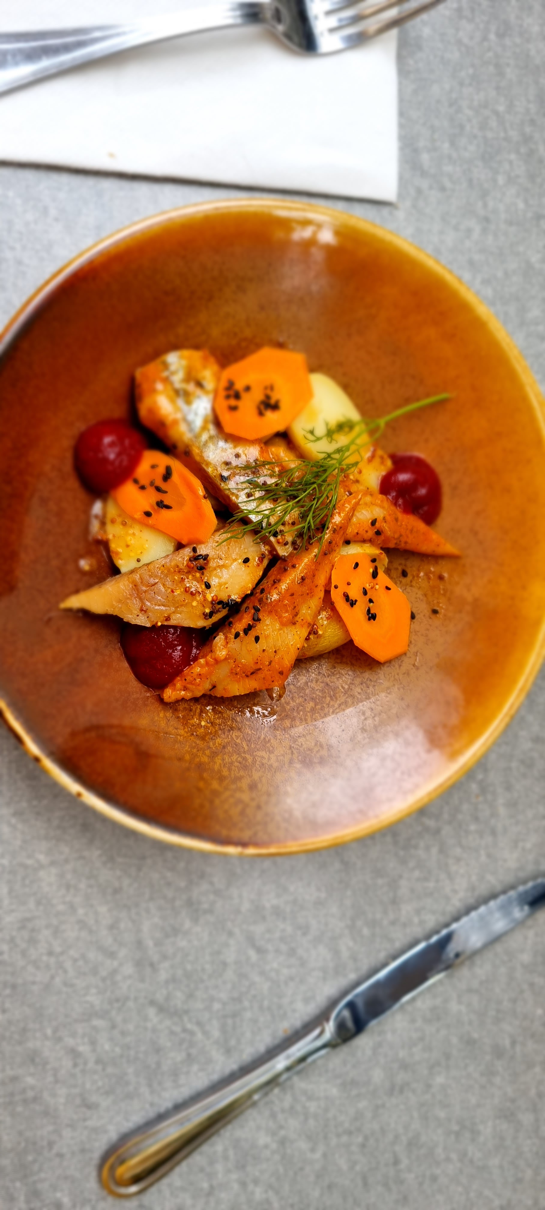 Le cadre est agréable, même en bord de route pour les non râleurs 😉 l'accueil se fait, nous nous installons. Le service est réactif, aux petits soins, dynamique, souriant, ça fait plaisir de voir un service aussi proche du client ! Quant aux plats....... Une dinguerie. N'aimant pas le sucré je fais entrée / entrée /plat et mon amie le traditionnel entrée plat dessert. Des portions bien travaillées qui ne laissent pas sur votre faim, un souci du détail, de la beauté et du goût. Chapeau également à la cuisine la dessus !!! Quant aux boissons, un cocktail du jour, extrêmement bien travaillé et équilibré et un verre de vin rouge conseillé par Marie qui a sû enchanter les papilles de mon amie. On termine sur une note qu'on aurait pu imaginer salée mais il n'en est rien. ( Enfin..... Chacun son budget hein 😉) Donc un 100% sans fausse note pour ce moment top dont on est parties heureuses, le sourire derrière notre masque
