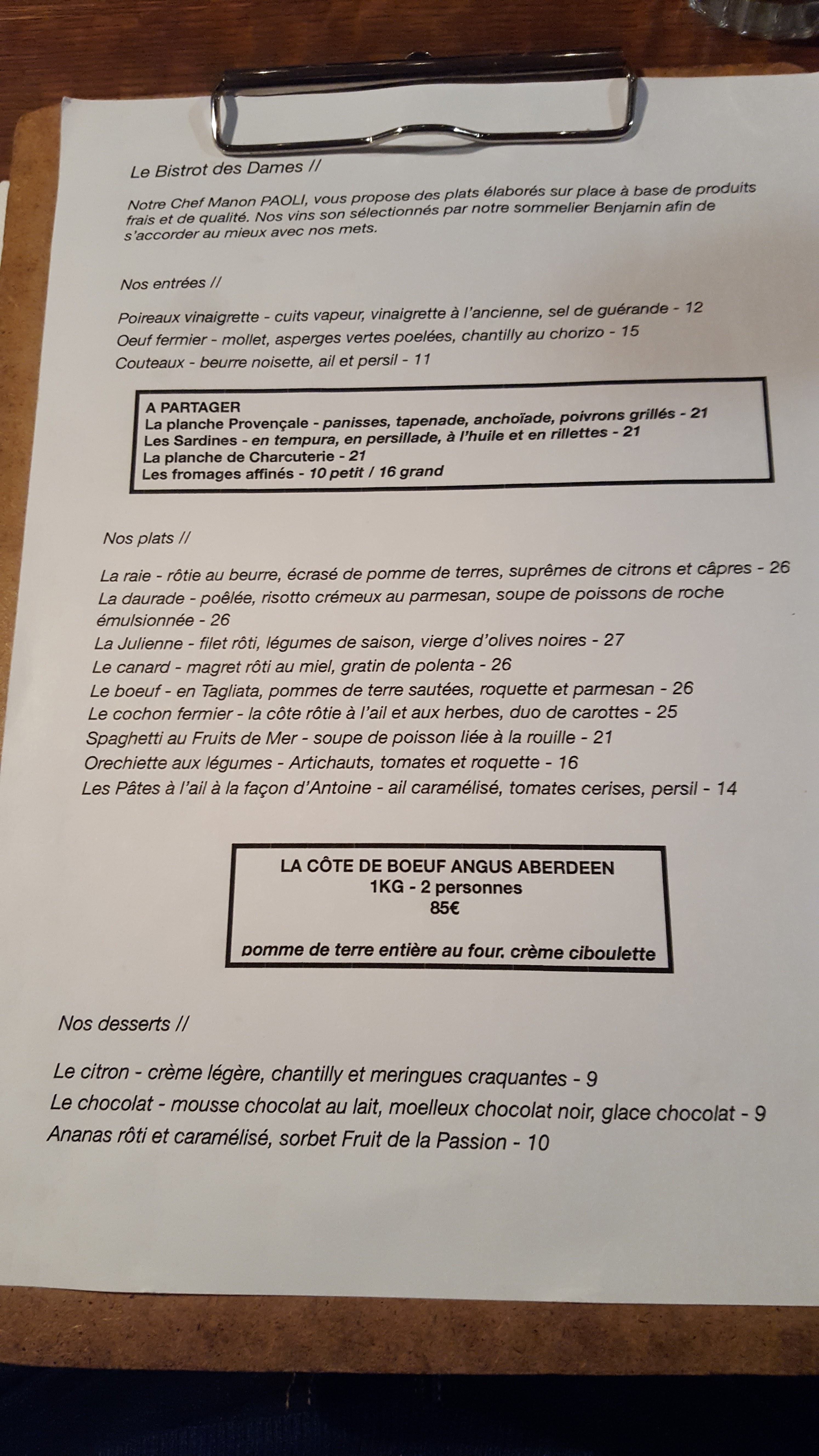 Nous sommes allé dîner un soir au Bistrot des Dames et ce fût un plaisir. Deux très bons cocktails, une assiette de pâtes généreuse agrémenté de chorizo et de gambas. Petit détails plaisant dans cette situation, on nous a apporté une assiette à chacun pour pouvoir y déposer les carcasses des gambas. La terrasse est très agréable, sur une place charmante à deux pas du vieux port. La cerise sur le gâteau était la serveuse qui était non seulement très professionnelle mais aussi un réel rayon de soleil, souriante, agréable avec le bon mot pour chaque situation. Probablement le meilleur service que j'ai eu. Juste pour ça je recommande fortement !