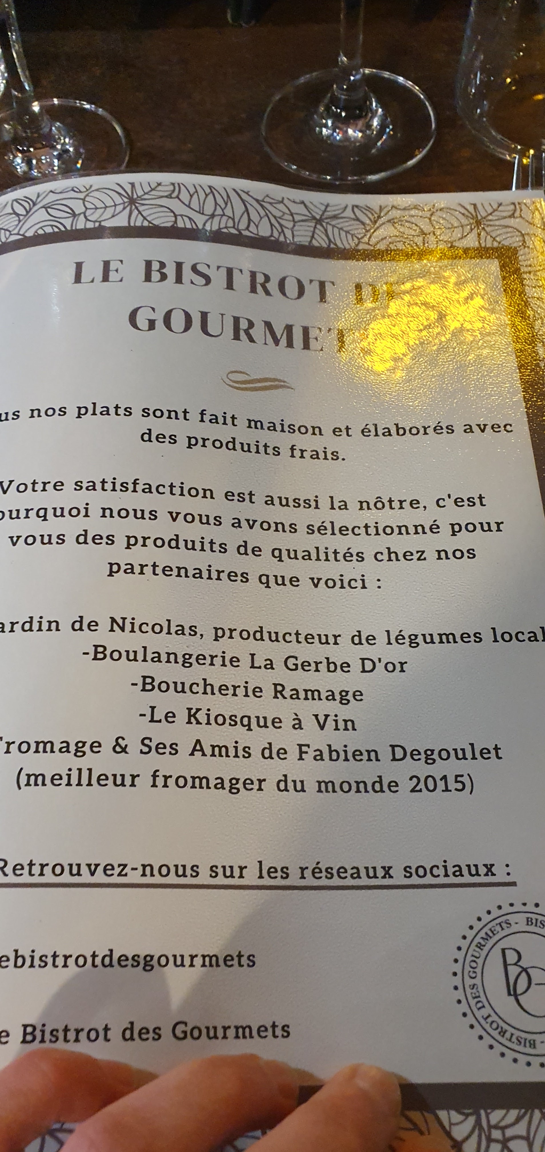 Je donne très rarement mon avis mais ce soir j’ai été séduite par « le bistrot des gourmets ». Le dîner était parfait de la mise en bouche jusqu’au dessert. Vous avez le choix entre 3 entrées 3 plats et 3 desserts ,tout est fait maison avec des produits frais c’est un délice. J’ai payé 33€ pour un plat/dessert et 1verre de vin le rapport qualité/prix est très correct. Allez-y et régalez vous!