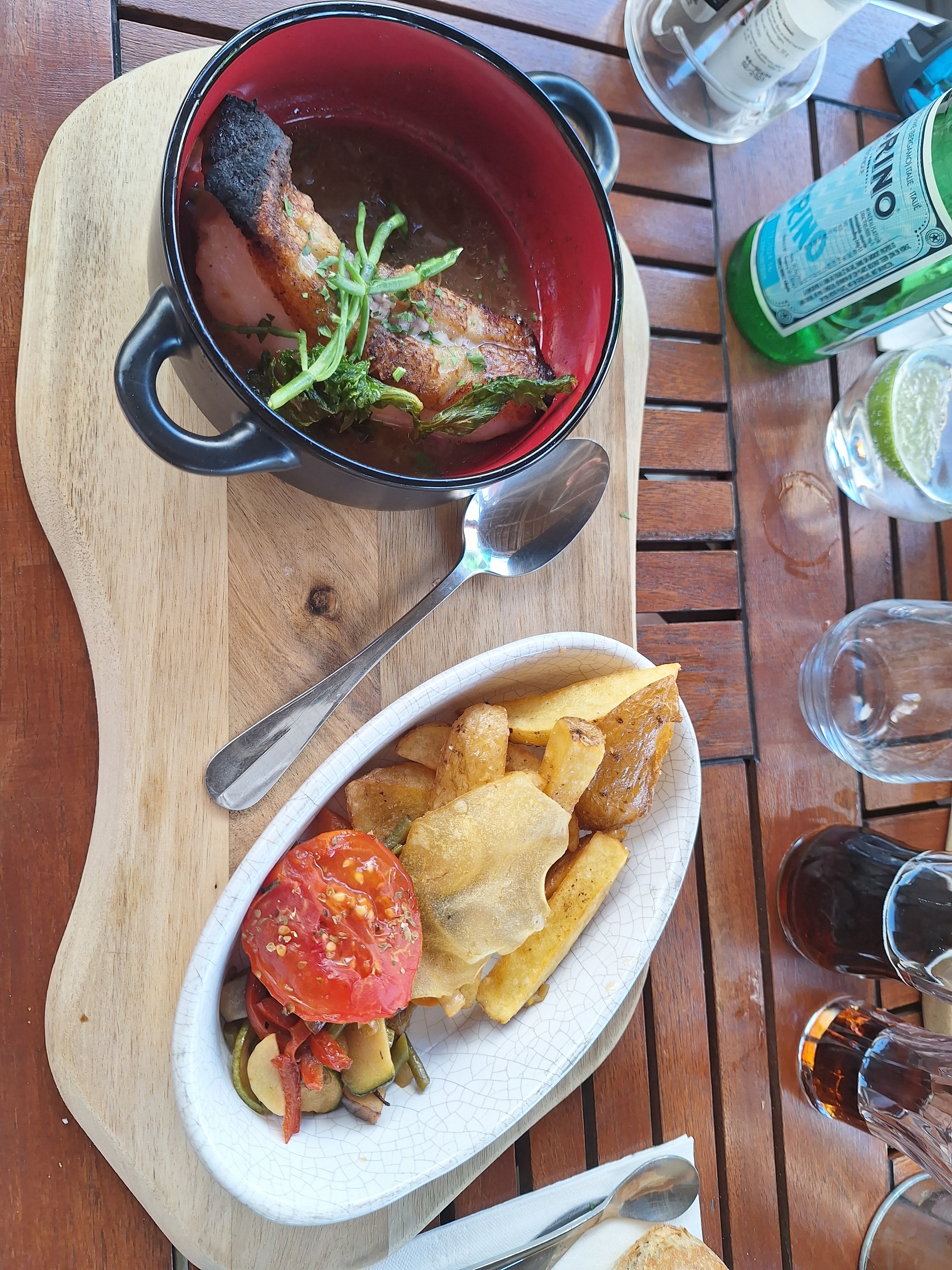 Repas autour des produits de la mer très réussi : saumon et coquillages cuits goûteux et bien accompagnés. Restaurant sympathique avec une superbe salle extérieure en été.