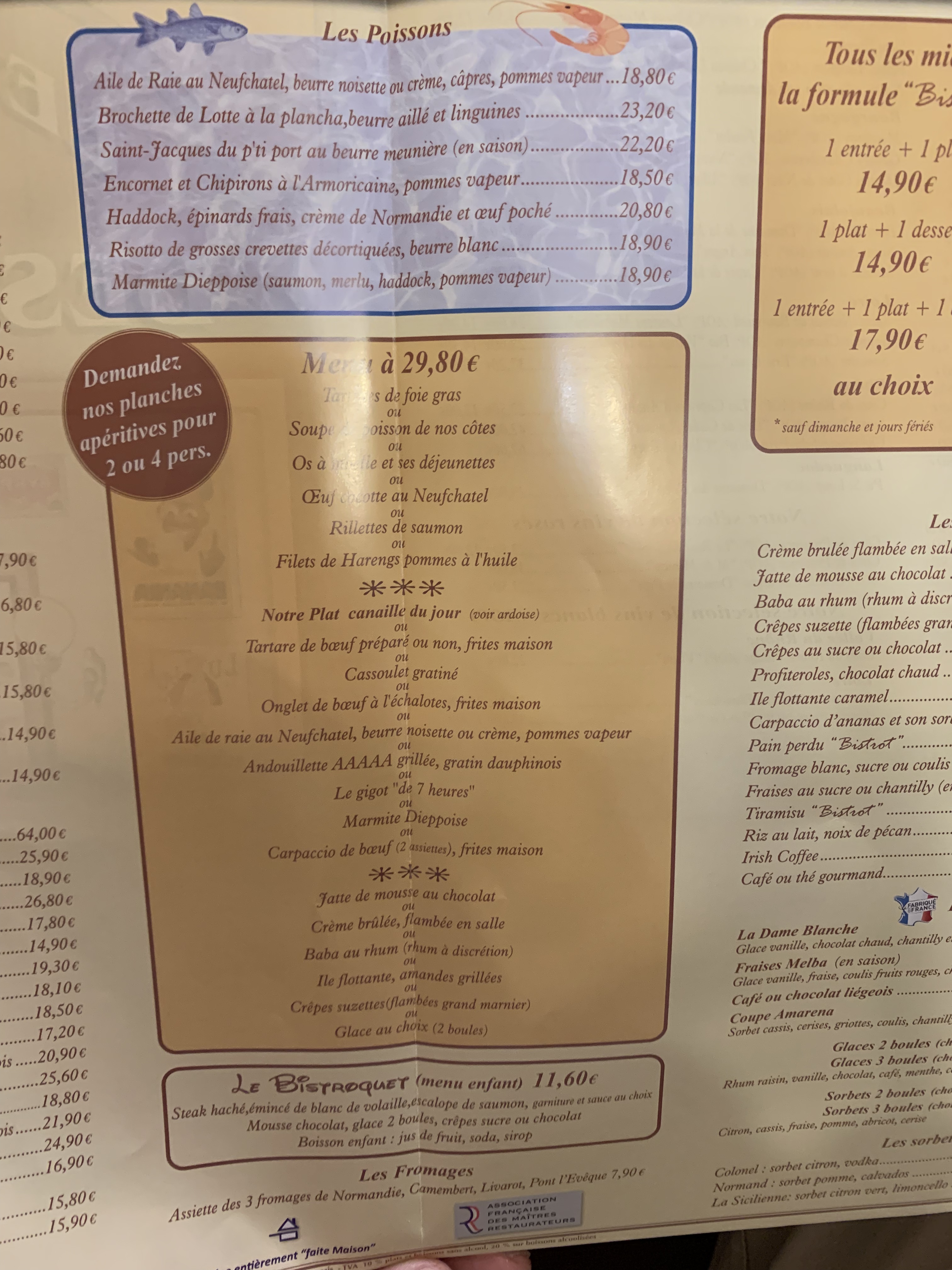 L’année dernière, nous n’avons pas pu entrer dans ce restaurant car il y avait trop de monde. Cette année, nous avons fait des réservations 2 semaines avant notre arrivée le 27/10/18. La nourriture est excellente et le service impeccable ! Très abordable ! 2 bouteilles de bordeaux @46,40 €, entrées autour de 13 à 15,50 €, apéro Pommeau 5,60 € pièce. Nous avons organisé une grande fête d'environ 15 personnes et notre serveur a eu la gentillesse de détailler la facture car nous payions tous séparément.