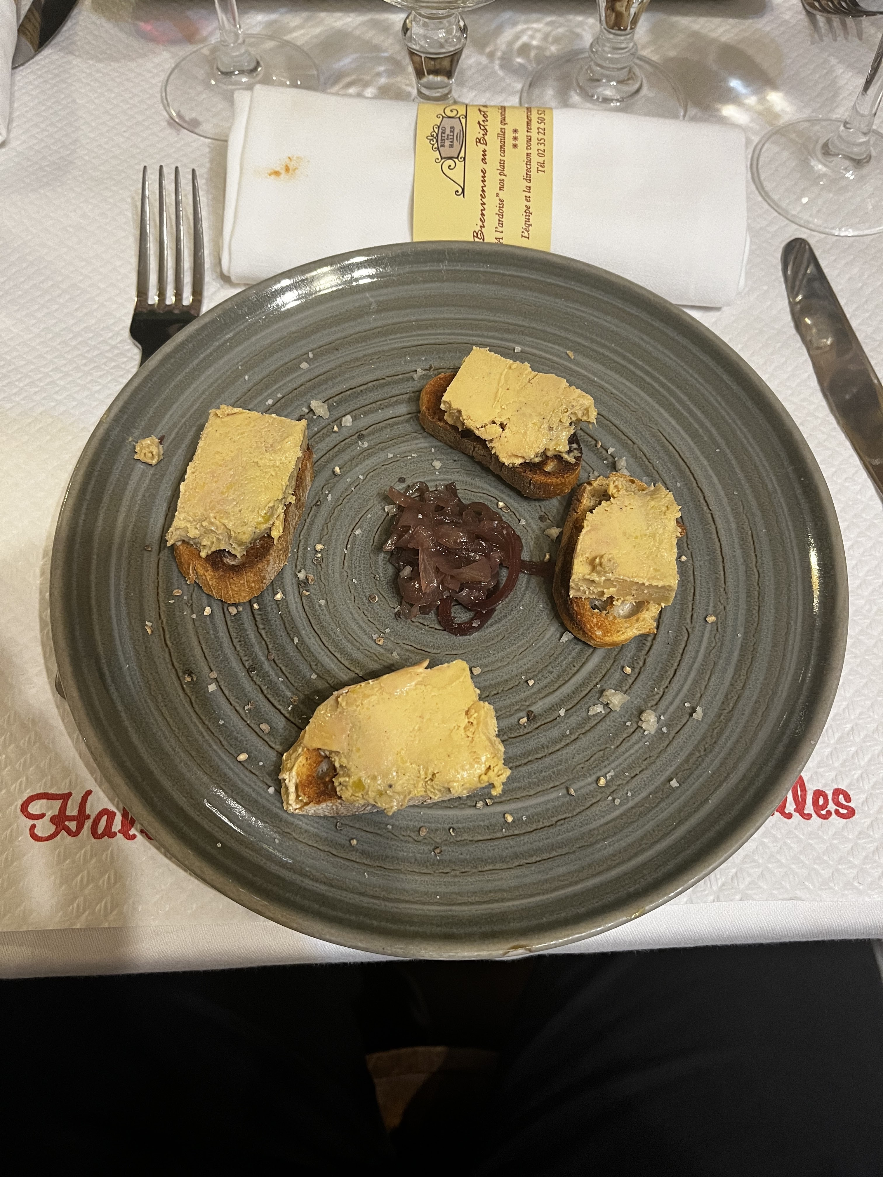 Une tranche de foie gras coupée en 4 morceaux déposés sur des croutons dans une grande assiette sans présentation. La viande cuite ou à point certe mais presque calcinée exterieurement impossible à couper La raie excellente et les desserts aussi. La jeune serveuse : pas aimable du tout et très brusque dans le service .Désolés Nous n'y retourneront pas.