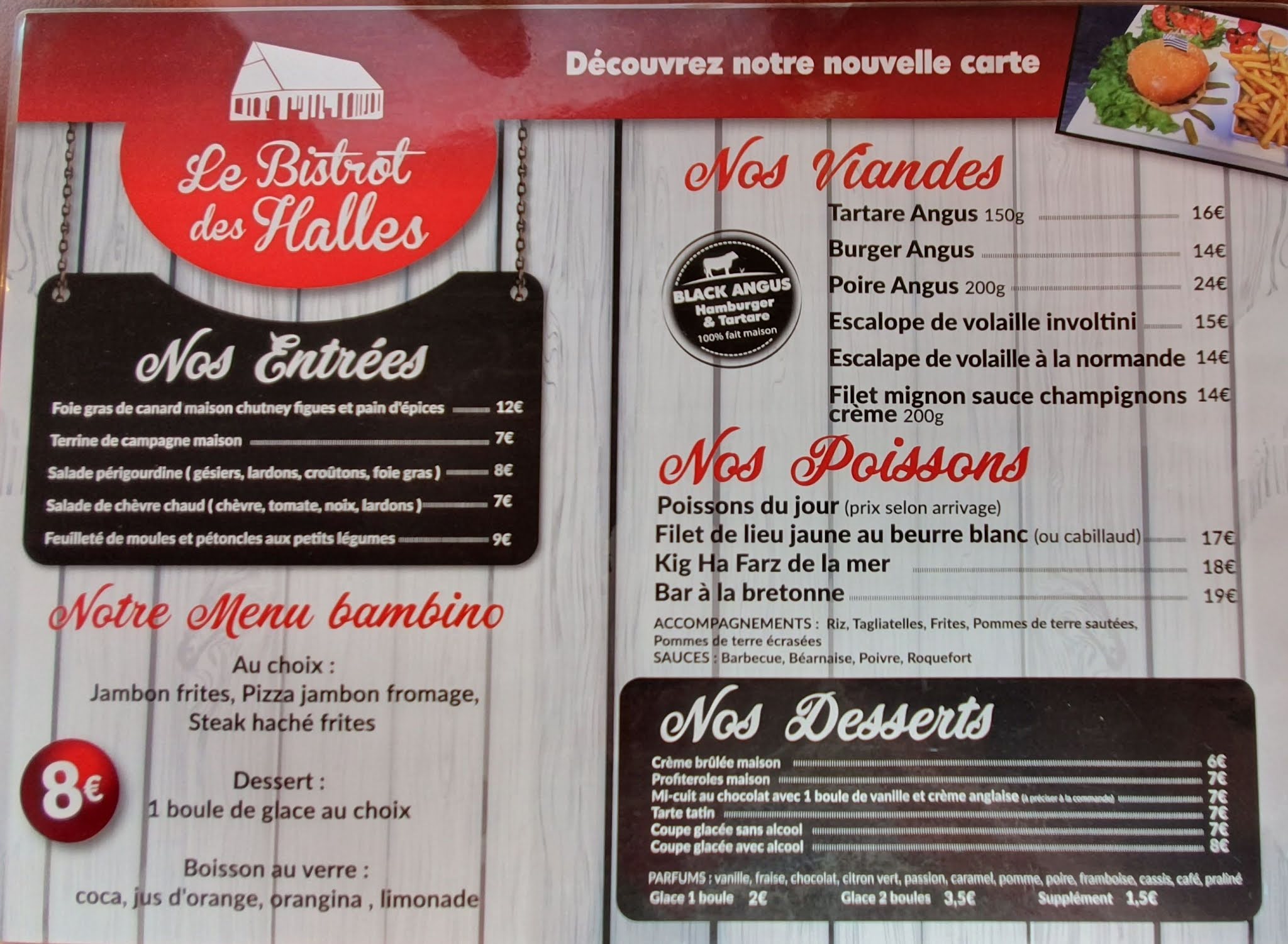 Tres belle carte avec un plus. On peut y déguster de la viande de la race Angus. Personnel hyper sympa .Prix très corrects .