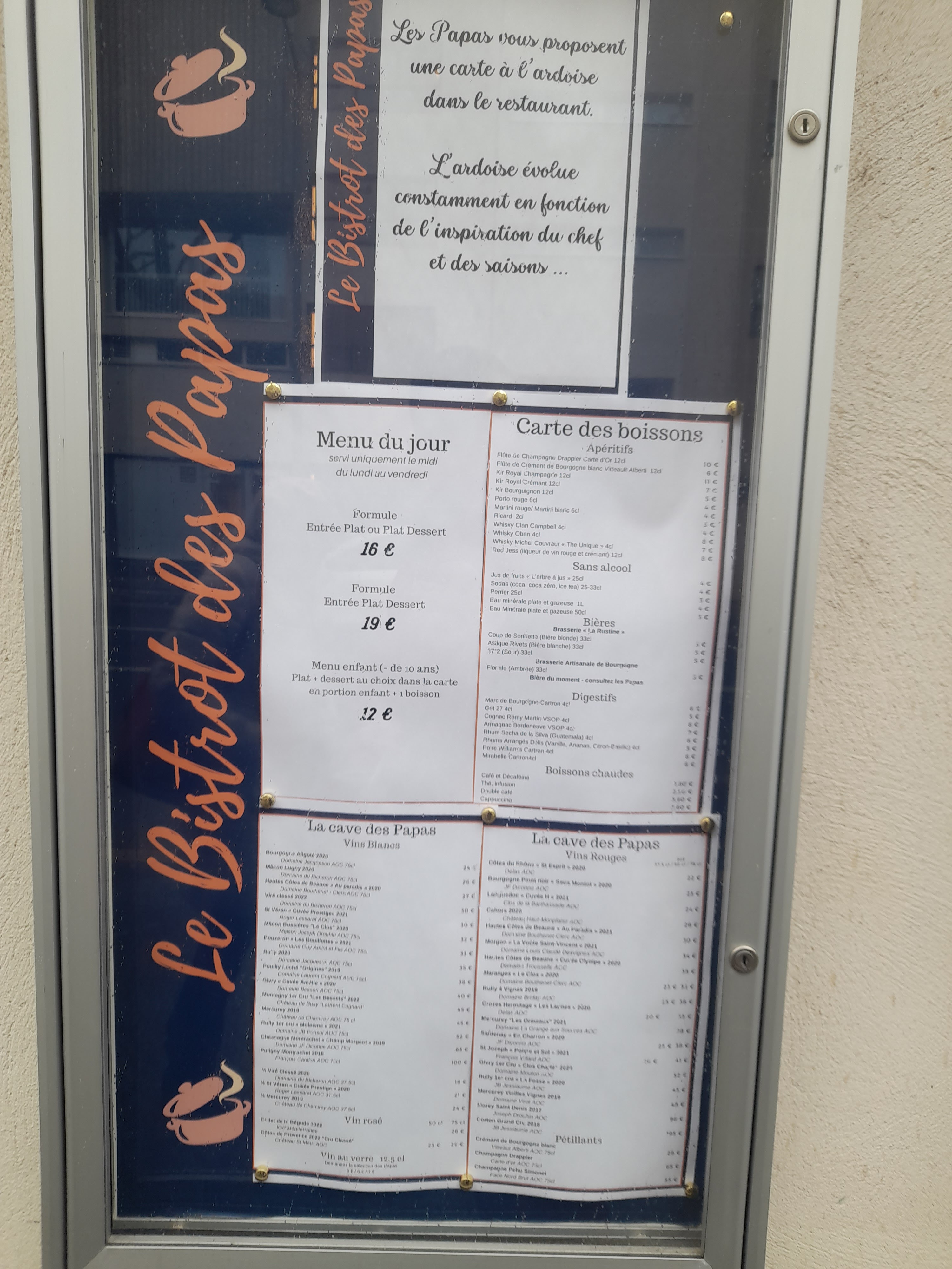 De passage à Chalon. Mon logement étant proche je suis allé sans réservation chez les Papas. Je n’ai pas de mots. Accueil excellent. La nourriture est incroyable,!on est proche du gastro mais avec de vrais portions. Carte des vins délicieuse. Charriot de dessert. Que dire… Une des meilleures adresses de ces 5 dernières années. Allez y les yeux fermés. Rapport qualité prix sans précédent.