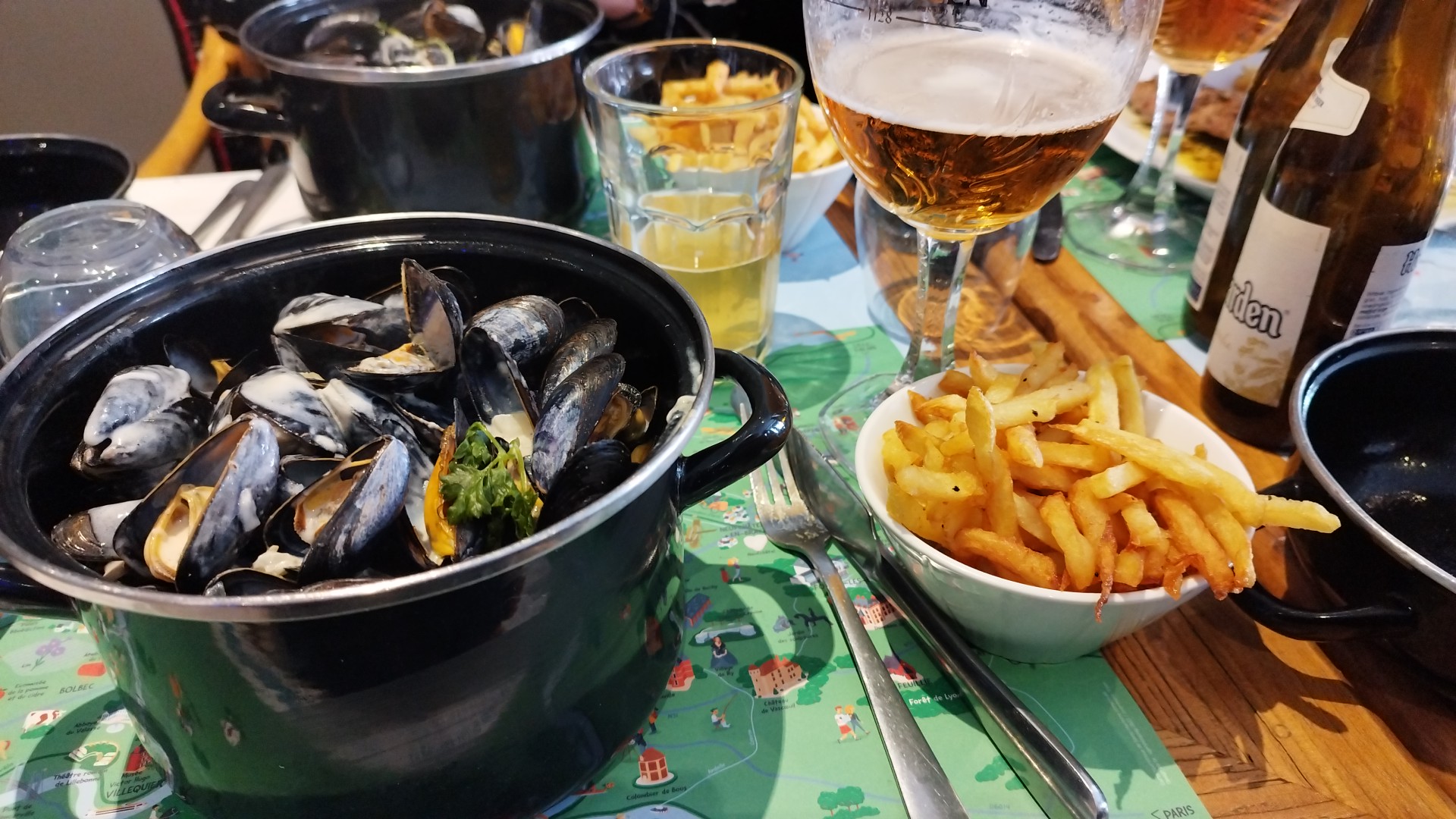 Bonne ambiance, beaucoup de clientèle. Pièces de bœuf larges de 3 centimètres, plus de moules disponibles, peu de pain et plutôt sec. Cependant les prix sont peu élevés, donc pas vraiment critiquable. Service à revoir, les verres apéritifs et les carafes d'eau vides se sont accumulés au bout de la table. Résumé : pas sensationnel, quelques points à améliorer mais suffisant pour un petit budget.