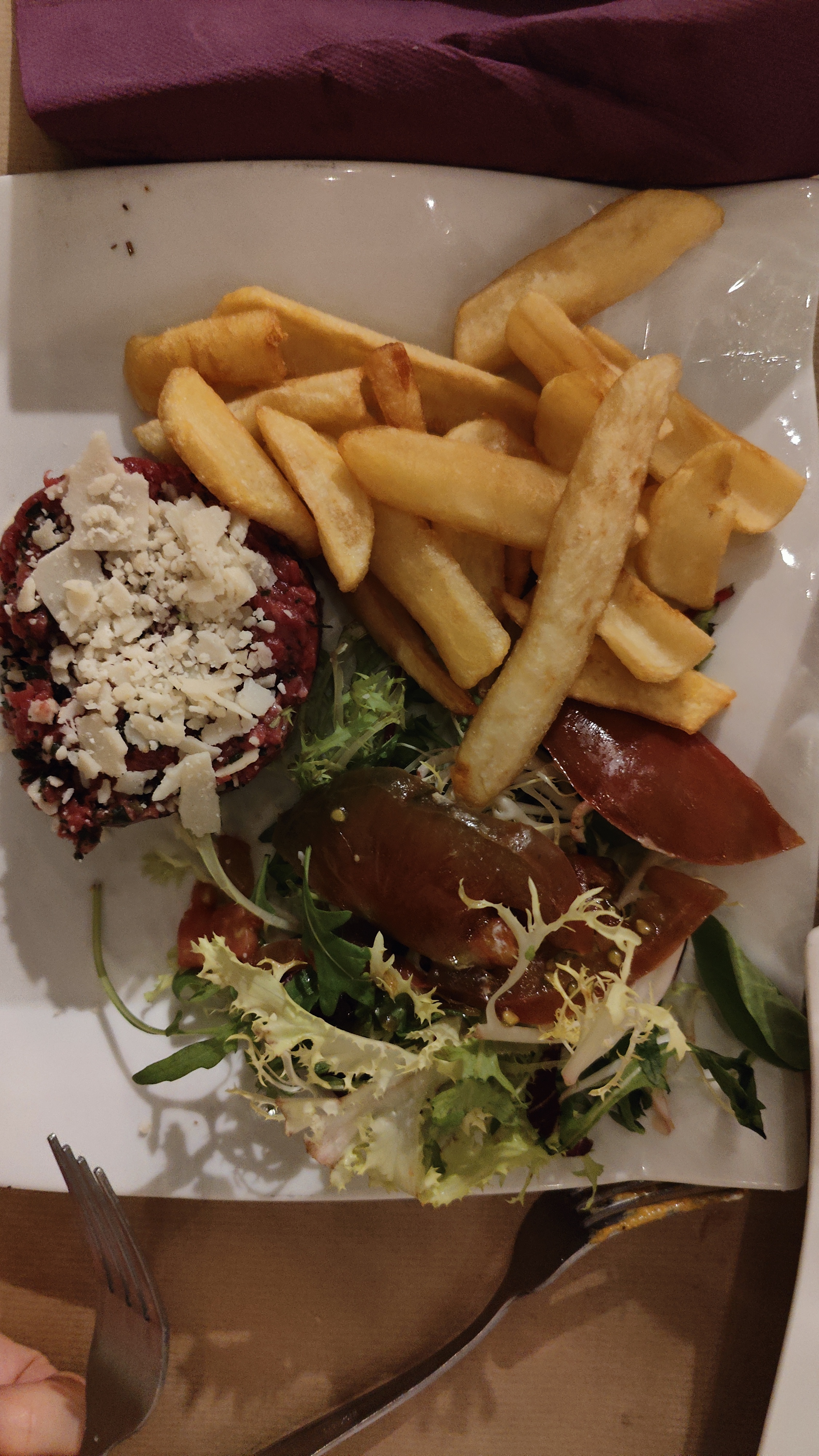 Une terrasse géniale, arborée, calme, en plein centre historique et pour couronner le tout, un délicieux steak tartare accompagné de pommes soufflées ou grenailles. Jolie salade. Très bon rapport qualité prix.
