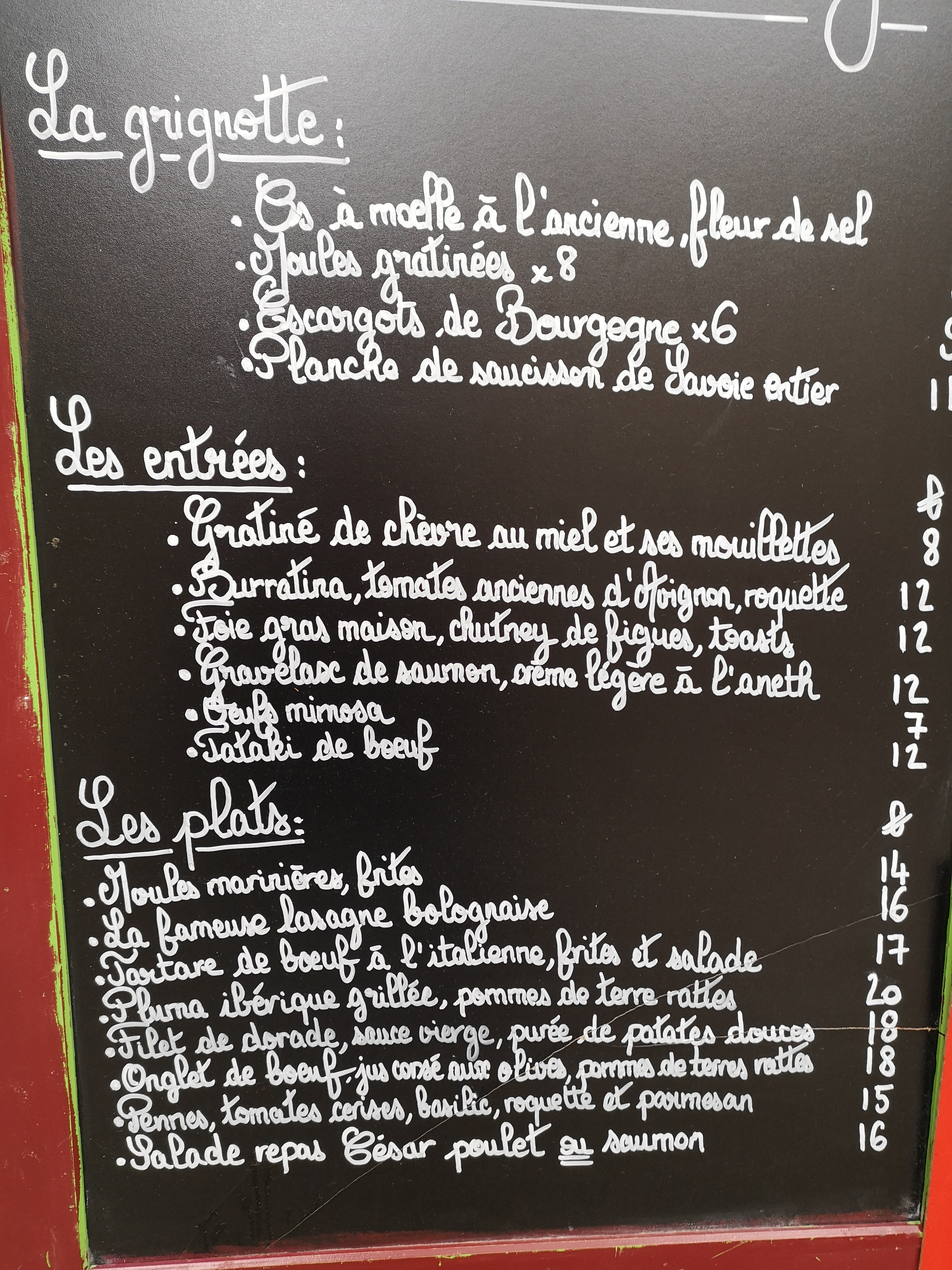 J'ai séjourné dans un appartement donnant sur le Bistro pendant dix jours et j'ai visité 3 fois ! Deux fois pour le déjeuner et pour le dîner lors de notre dernière nuit. Le personnel est vraiment sympathique, très arrangeant avec nos terribles français et la nourriture est excellente. Le plat du jour change tous les jours et était toujours intéressant. Très bon rapport qualité/prix et toutes les portions sont de bonne taille - vous ne repartirez pas affamé ! La carte des vins est également très bonne, ils ont quelques vins recommandés indiqués sur le menu et ils sont particulièrement bons.
