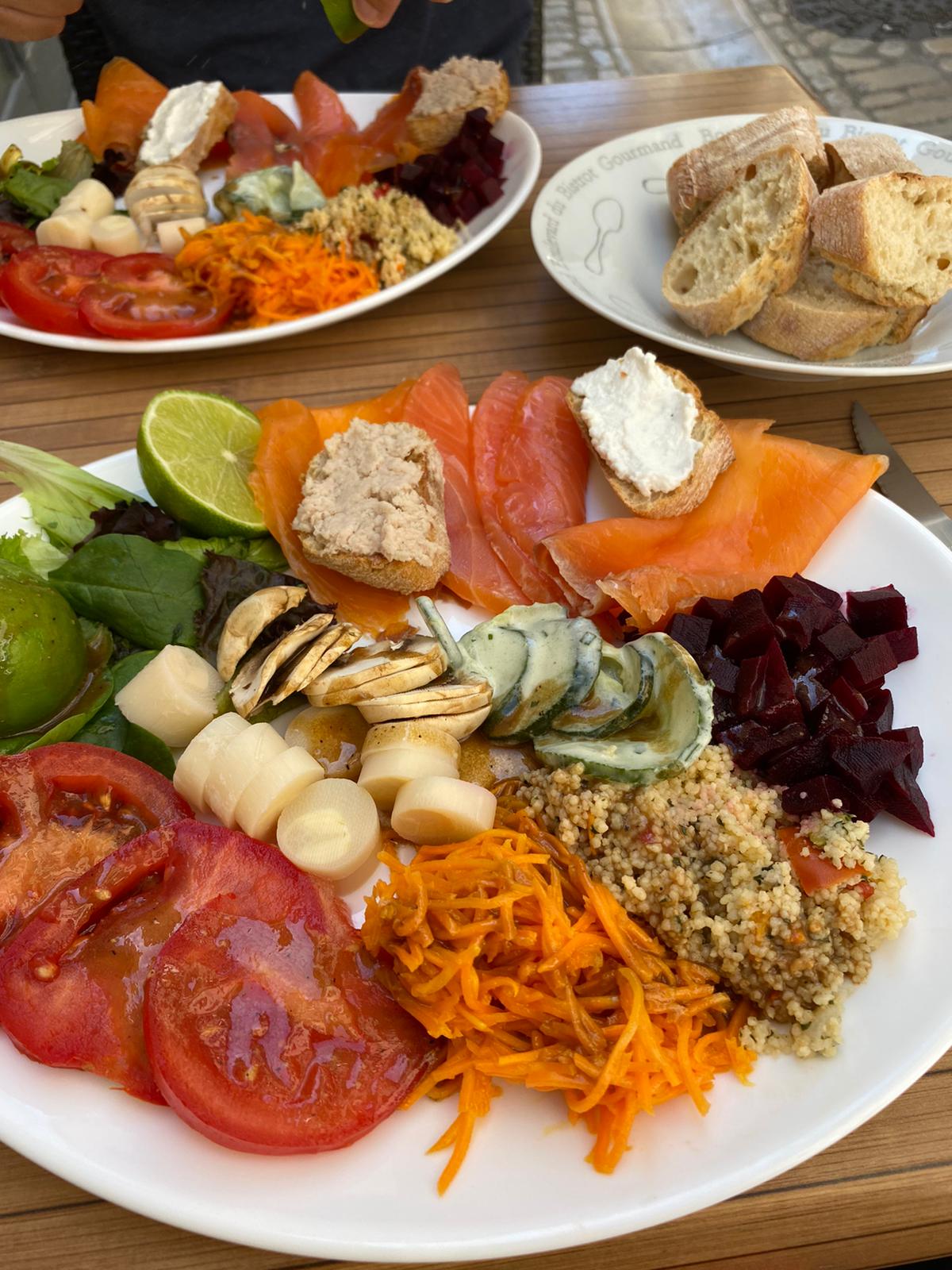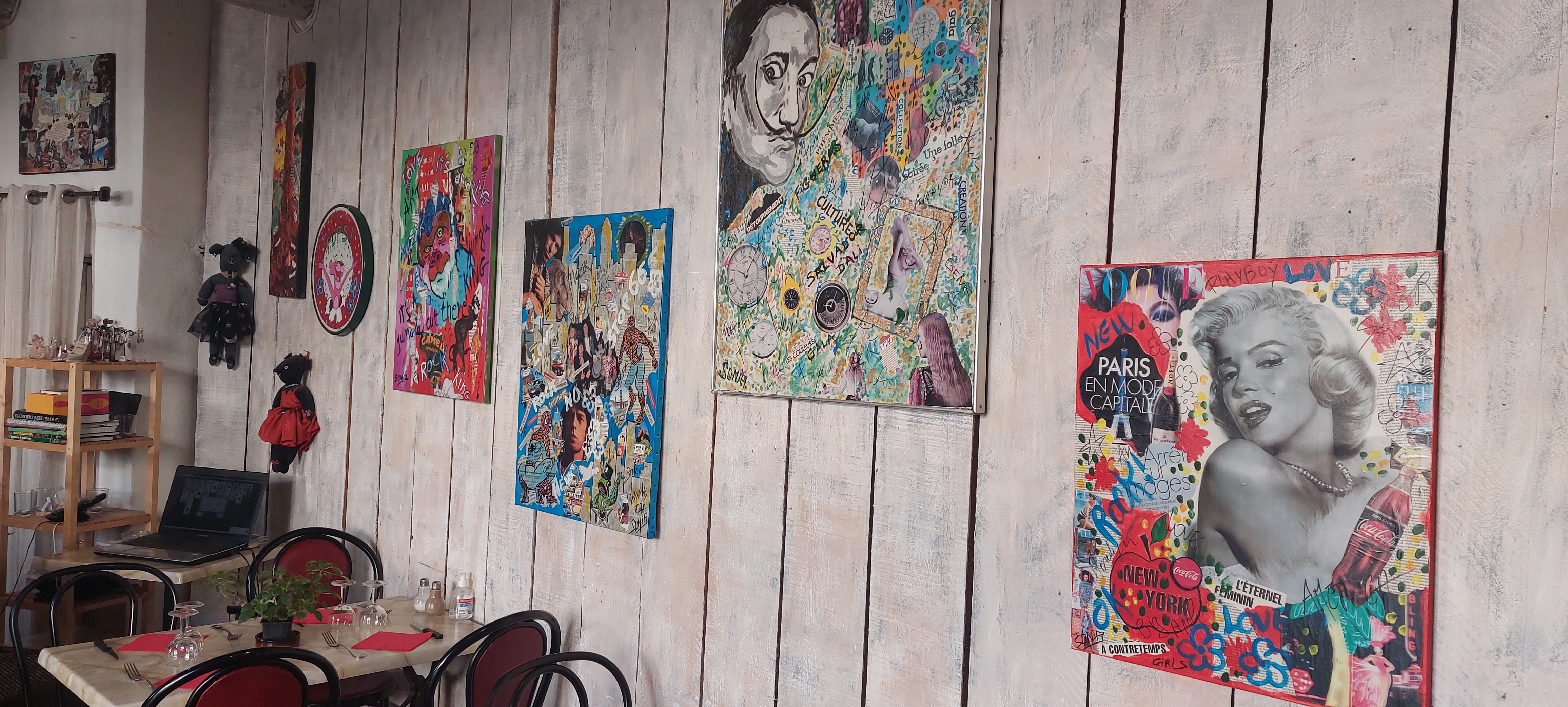 À l’occasion d’une journée entre amies, après la visite du marché du samedi matin, un très sympathique déjeuner avec un accueil agréable par deux artistes, l’une en cuisine et la seconde expose ses œuvres qui habillent gaiement les murs 🤩
