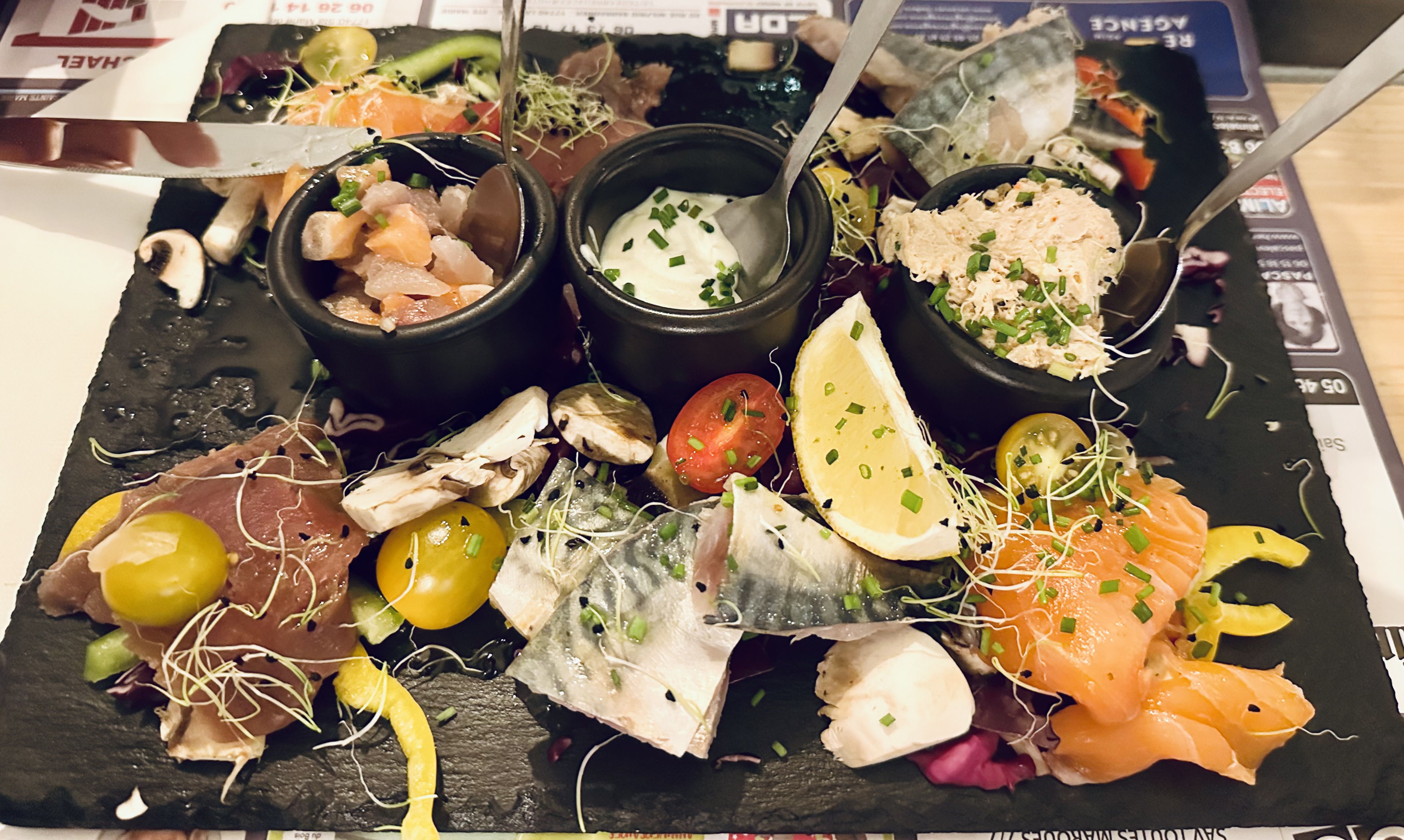 Petit repas à midi avec Ardoise de poissons et huîtres au top Merci