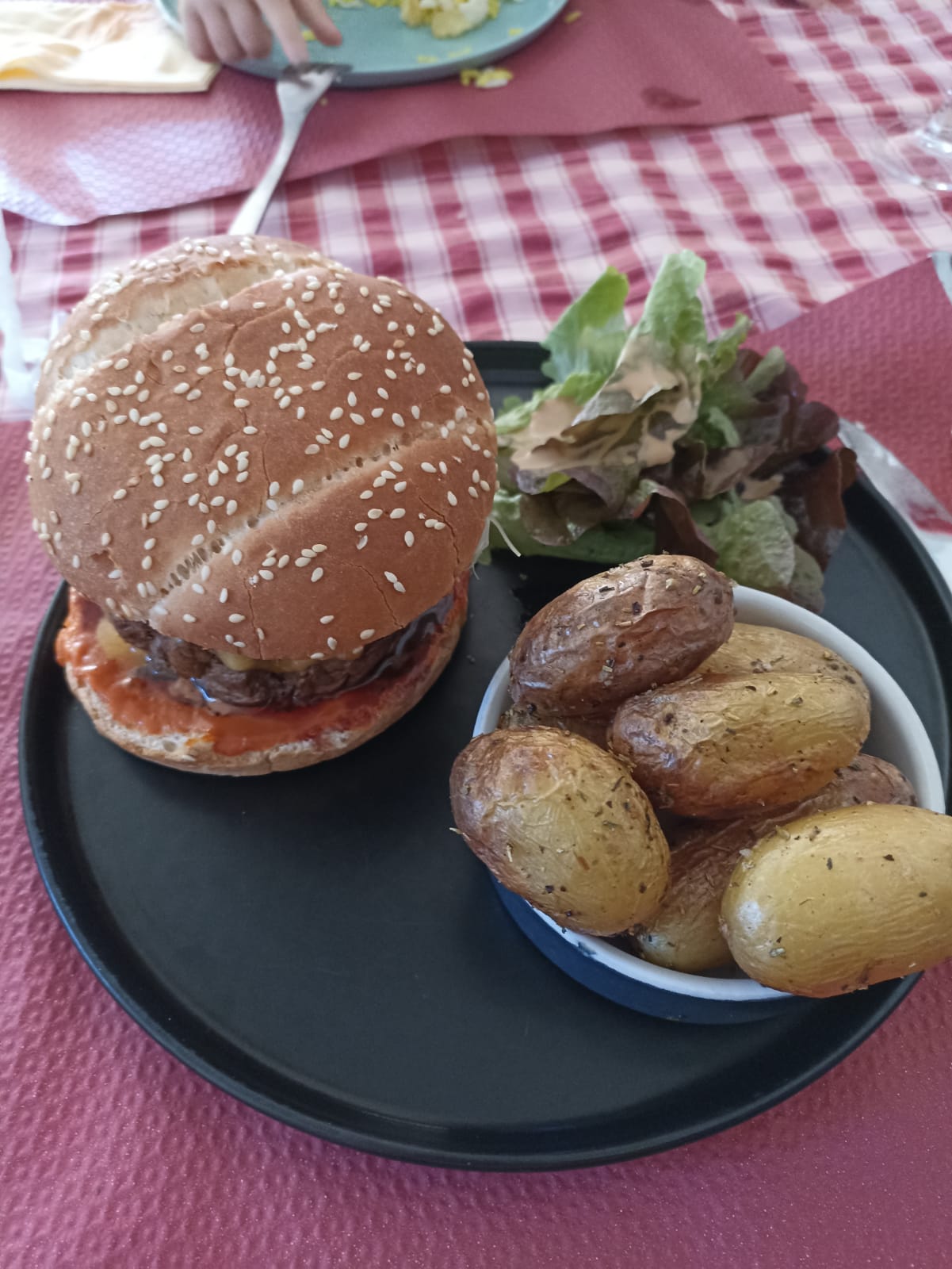 Nous y avons mangé à 9 (5+ 4 enfants)le jour de Toussaint sans réserver.. tout était parfait 👍 Les enfants servis en 1er(il était 14h15)steak succulent coupé au couteau ou poulet et 1 boule de glace et boisson. Belle entrecôte cuite à point.. steak de thon délicieux.. Burgers parfaits..desserts sympas( moelleux et glace.. cafés gourmands(4 desserts) ..colonel.. Tous ravis et satisfaits !
