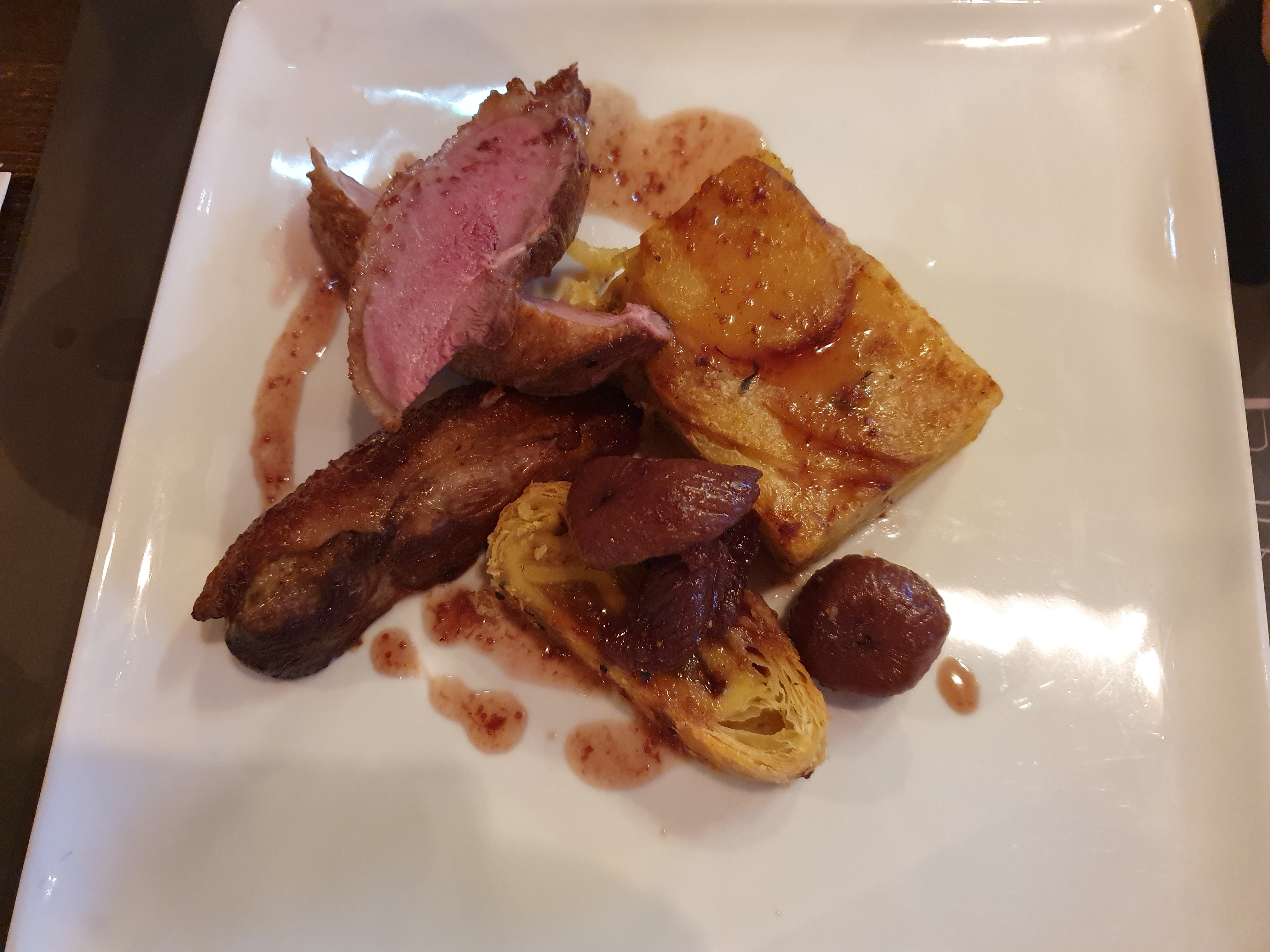 Accueil sympathique Magret de canard cuit bien rosé comme il faut avec une petite tarte aux pommes en accompagnement mais pour moi il manque quelques légumes en accompagnement, et excellent pour le Saint Pierre avec purée de choux fleur et chicon grillé Établissement à recommander et il vaut mieux réserver