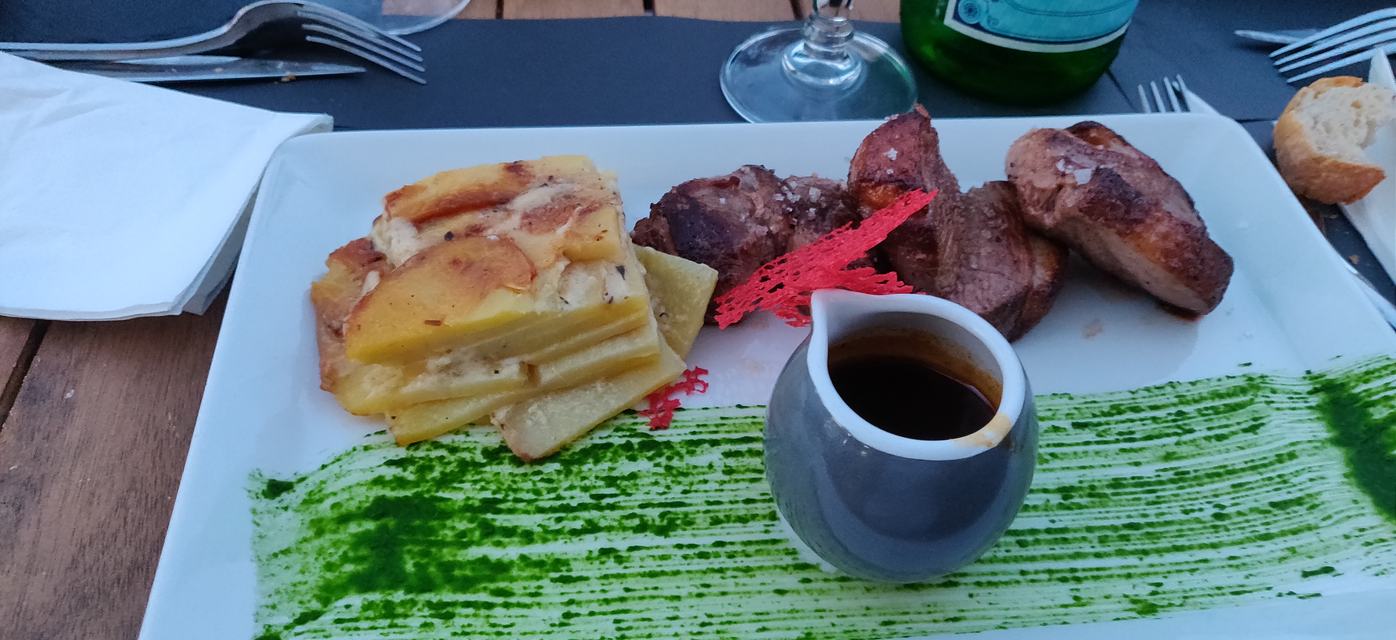 Mouerf, apéros originaux, 12 (bons) escargots a 16€, petite côte de bœuf (correcte) a 50€, verre de vin oublié, café gourmand sympa.. mais un peu cher.